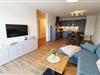 Die Wohnung überzeugt mit einem hellen Wohnbereich, gemütlichem Sofa, Smart-TV und direktem Zugang zur großzügigen Dachterrasse. Bodentiefe Fenster sorgen für viel Licht und eine angenehme Atmosphäre. Die offene Küche ist modern ausgestattet – ideal für gemeinsame Kochabende.