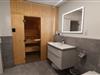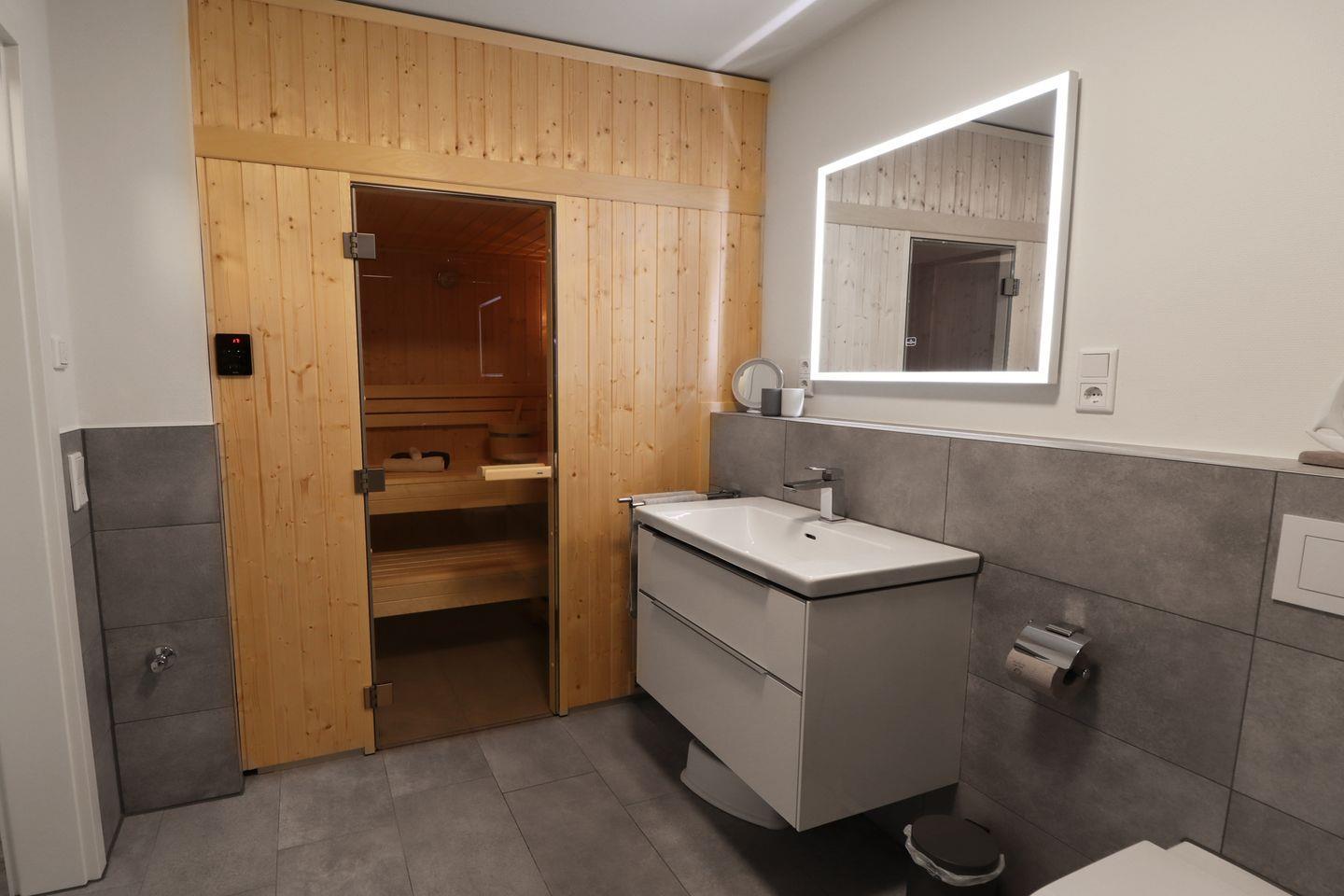 Das moderne Duschbad ist stilvoll gestaltet und verfügt über eine ebenerdige Dusche, einer Sauna, einen großen Spiegel und ein Fenster für angenehmes Tageslicht.