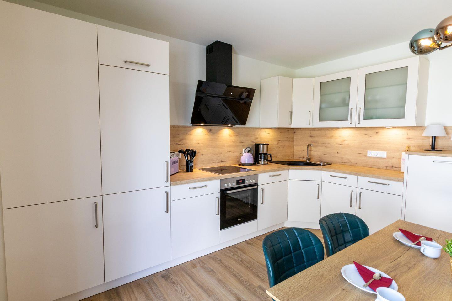 Der helle Wohnbereich mit großen Fenstern öffnet sich zur weitläufigen Dachterrasse. Hier könnt ihr sonnenbaden, gemeinsam essen oder einfach nur entspannen. Die offene Küche ist mit hochwertigen Geräten voll ausgestattet – ideal für gemeinsames Kochen. Für Unterhaltung sorgen Smart-TV, SONOS-Sound und eine gemütliche Sofaecke.