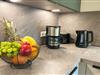 Der offene Wohnbereich mit direktem Zugang zur Terrasse lädt zum Verweilen ein. Große Fenster lassen viel Tageslicht herein und schaffen eine freundliche Atmosphäre. Die voll ausgestattete Küche bietet alles für gemeinsame Kochabende – inklusive Raclette-Grill für gemütliche Stunden. Im Wohnbereich steht ein hochwertiges Schrankbett für zwei Gäste bereit. Smart-TV, Bücher und Spiele sorgen für beste Unterhaltung.