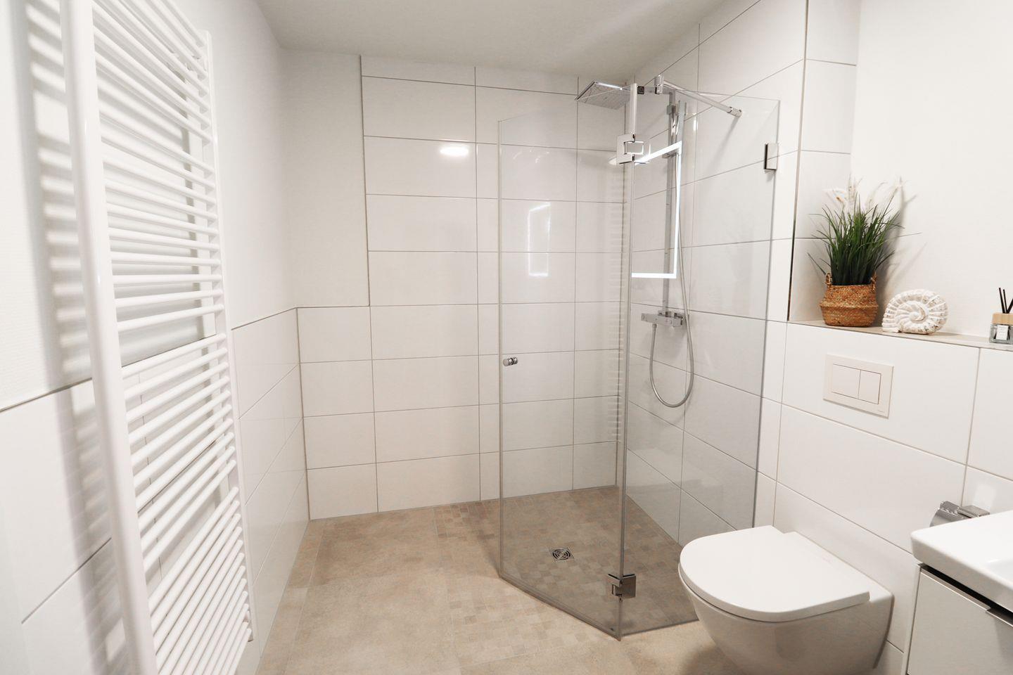 Genieße deine Auszeit im modernen Badezimmer mit bodentiefer Dusche und eigener Sauna – perfekt, um nach einem aktiven Tag am Deich zur Ruhe zu kommen.