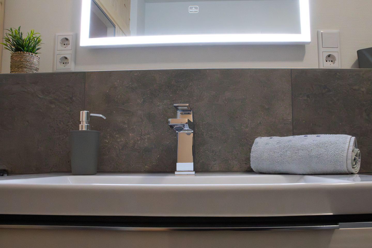Dein persönlicher Wellnessbereich erwartet dich mit einer privaten Sauna und einem modernen Bad. Die bodengleiche Dusche mit Regenduschkopf sorgt für wohltuende Momente – perfekt nach einem Tag an der Nordseeluft.