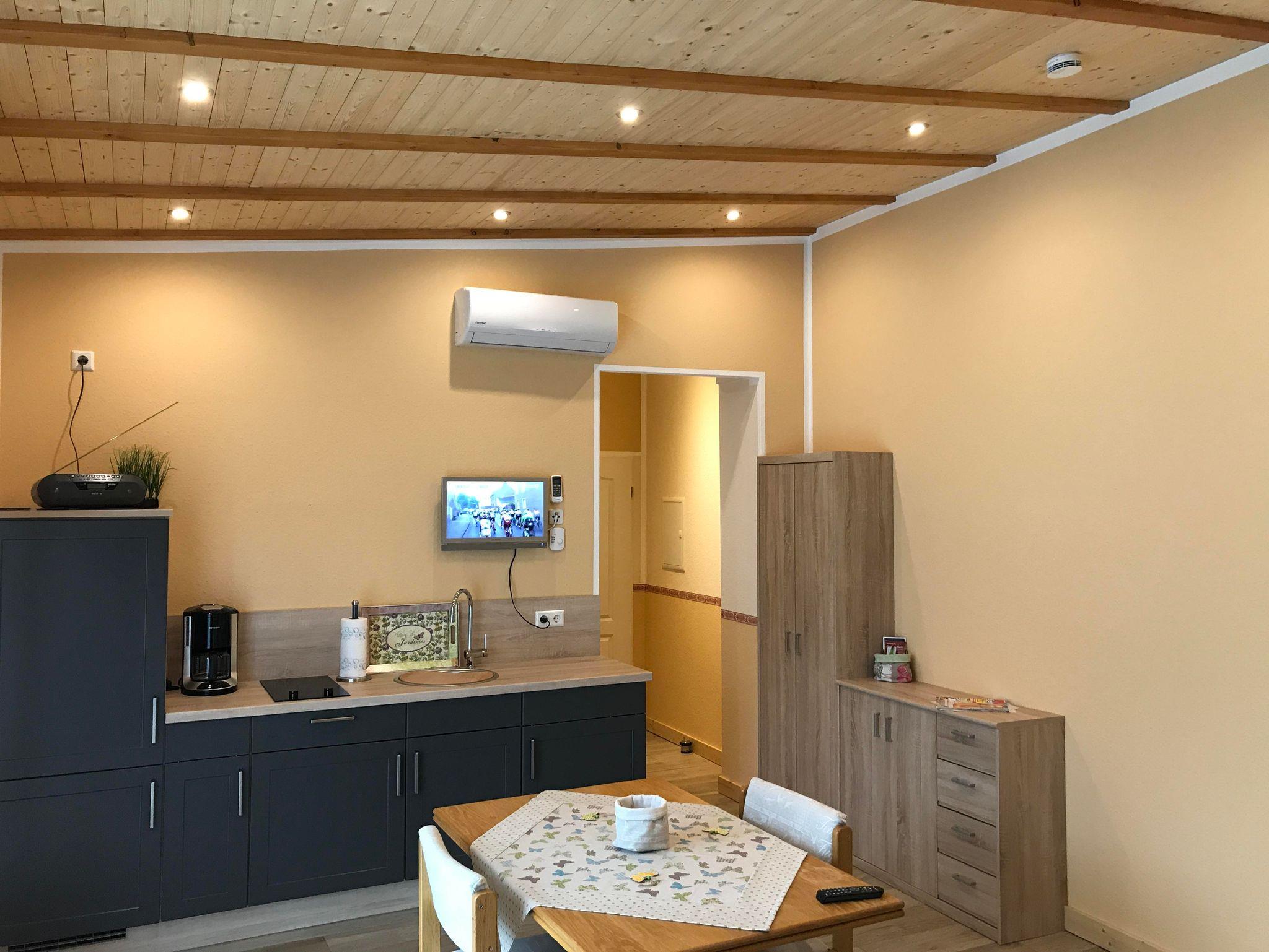 Komfort-Apartement für 2 Personen, Klimaanlage, Fußbodenheizung, Boxspringbett, ebenerdige Dusche, große Doppel-Glastür zum Hof, Küche, Fernseher.