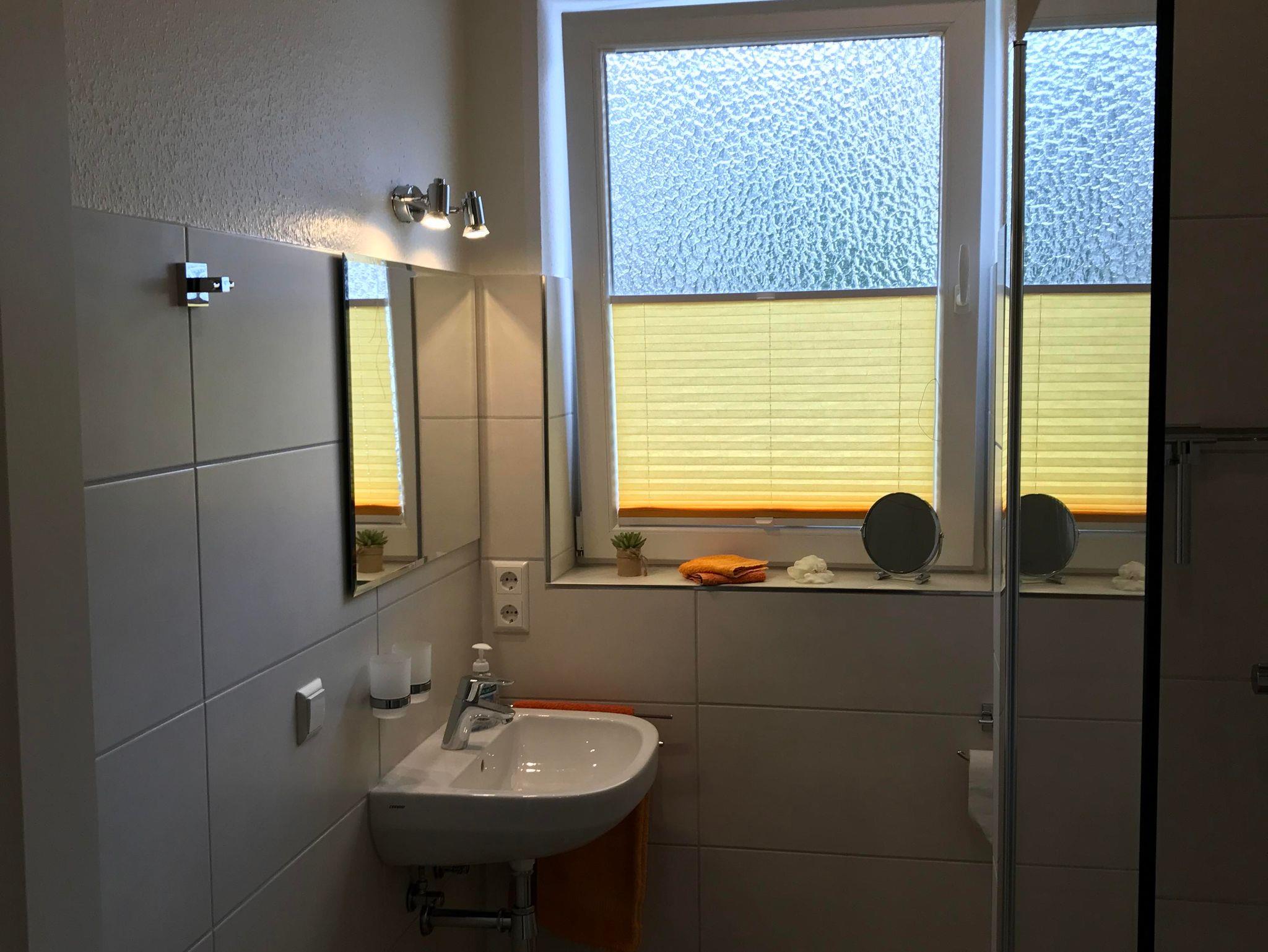 Das Bad verfügt über eine geräumige, ebenerdige Dusche (Dusch- und Regenduschkopf), sowie eine Handtuchheizung. Ein Fön ist vorhanden.