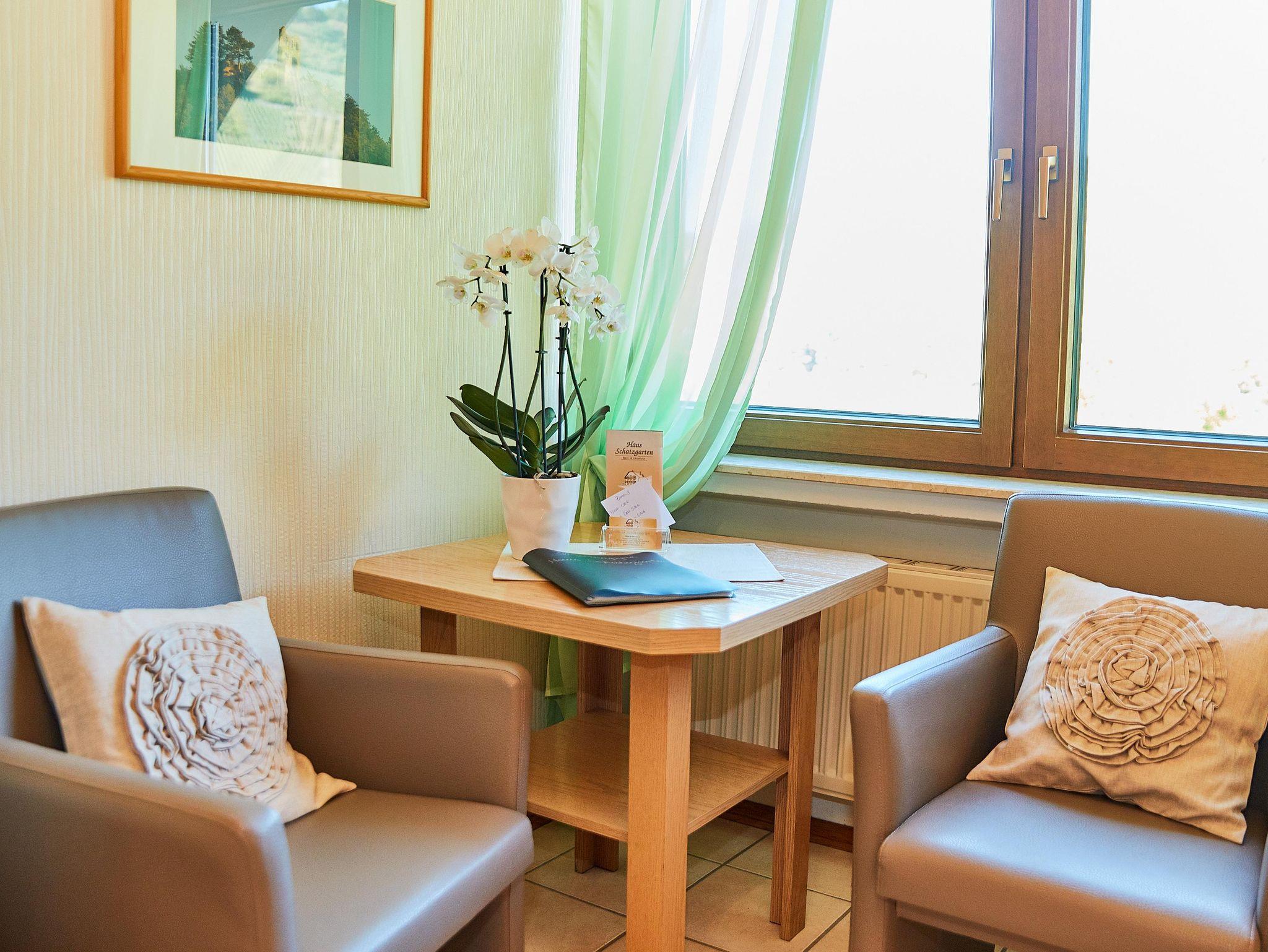 Doppelzimmer im EG, Hauseingang-, Garten- und Frühstücksraum, barrierefrei zugänglich, Dusche/WC, Sitzgruppe