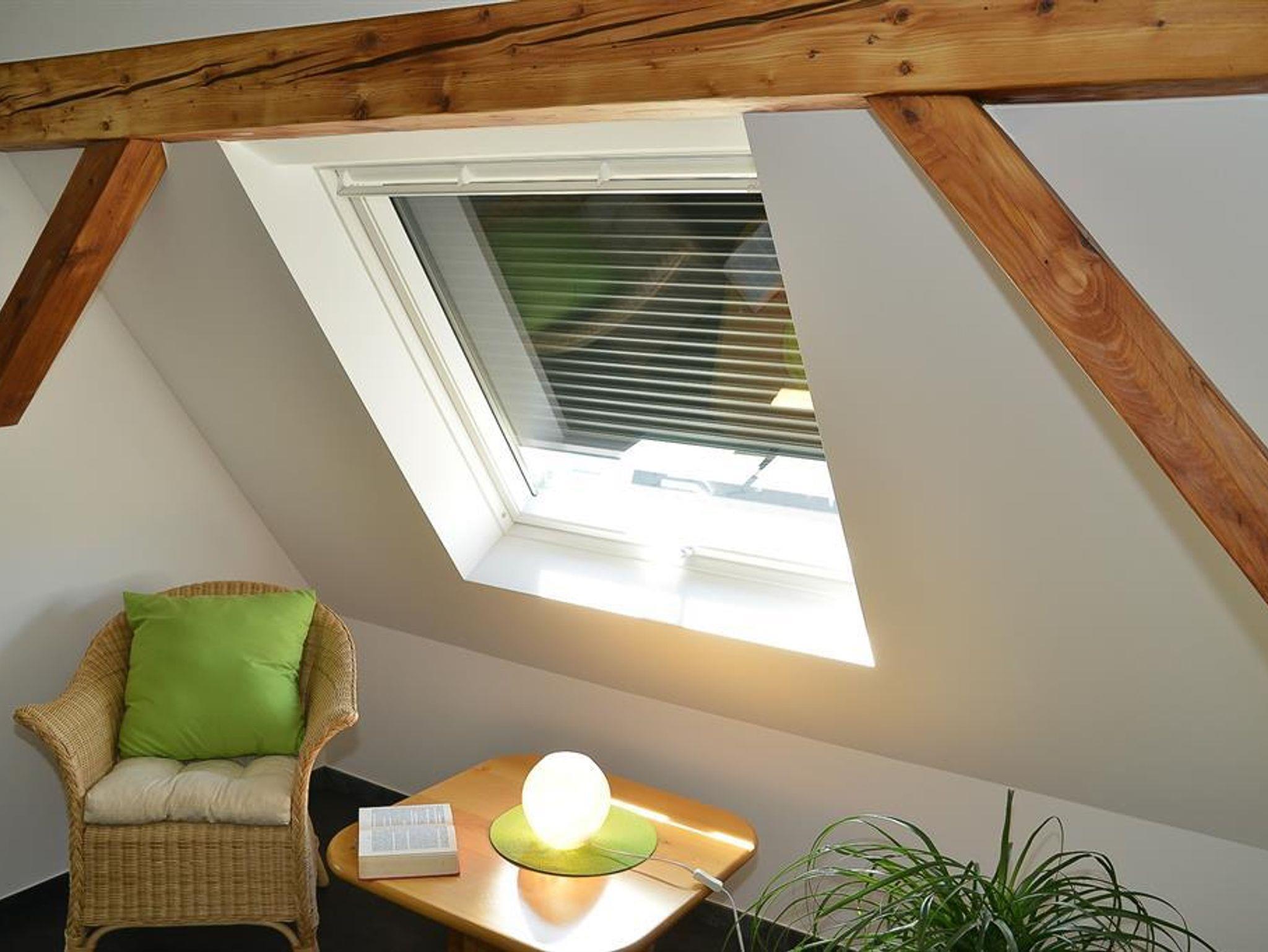 Die Wohnung im Dachgeschoss ( Appartement 2) verfügt über ein Schlafzimmer mit großem Doppelbett, ein Wohnzimmer, ein modernes Duschbad und eine Küche mit gemütlichem Essplatz.