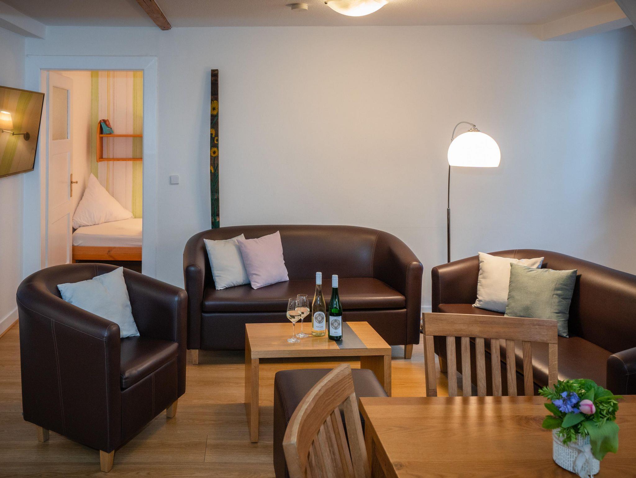 In unseren liebevoll restaurierten Apartments erwartet Sie Ruhe und Entspannung. Mit einem offenen Wohn- und Essbereich, ruhig gelegenem Schlafzimmer und einem Bad mit moderner Ausstattung fällt es leicht die Seele baumeln zu lassen. Zudem bietet ein Balkon oder unsere große idyllische Terrasse Gelegenheit die Sonnenstunden auszunutzen, sich sportlich zu betätigen z.B. beim Tischtennis spielen, oder in geselliger Runde zu Grillen und das leckere Essen zu genießen. Unsere gemütlichen Liegestühle laden dazu ein, z. B. bei einem unterhaltsamen Buch oder spannender Lektüre eine Zeit lang zu verweilen. Bei all dem dürfen unsere beliebten Weine nicht fehlen, die in jeder Ferienwohnung bereit stehen und nur darauf warten zu dem einen oder anderen Anlass getrunken zu werden, denn:
