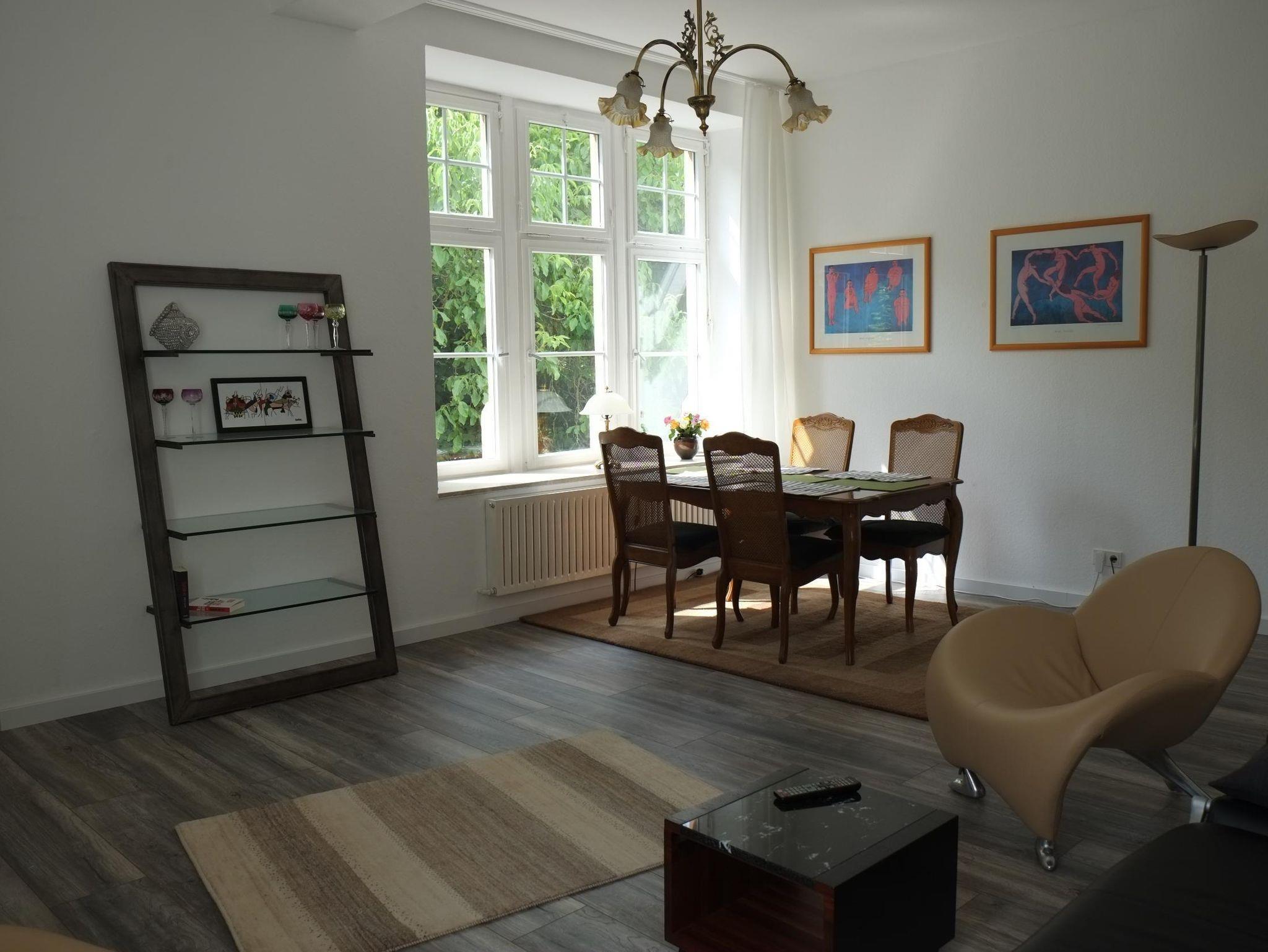 Die Wohnung verfügt über ein großes Wohn-Esszimmer mit Jugendstilfenstern und Blicken zum Osten und Süden ins Grüne. Das dicke Mauerwerk hält selbst im Hochsommer die Wohnung angenehm kühl. Auch in der kalten Jahreszeit ist die Wohnung angenehmzu beheizen und zu bewohnen. Es gibt zwei Schlafzimmer. Das größere ist mit Kirschholzmöbeln und einem 2m x2m großen Bett ausgestattet, das kleinere mit Spiegelschrank und einem 1,40m x 2m großen Bett. Eine neue saharagraue Einbauküche mit Spülmaschine und allen wichtigen Geräten ist vorhanden. Bad, WC und Flur sind funktional und schön eingerichtet. Die Wohnung ist komfortabel und für 1 –3 Personen zu mieten.