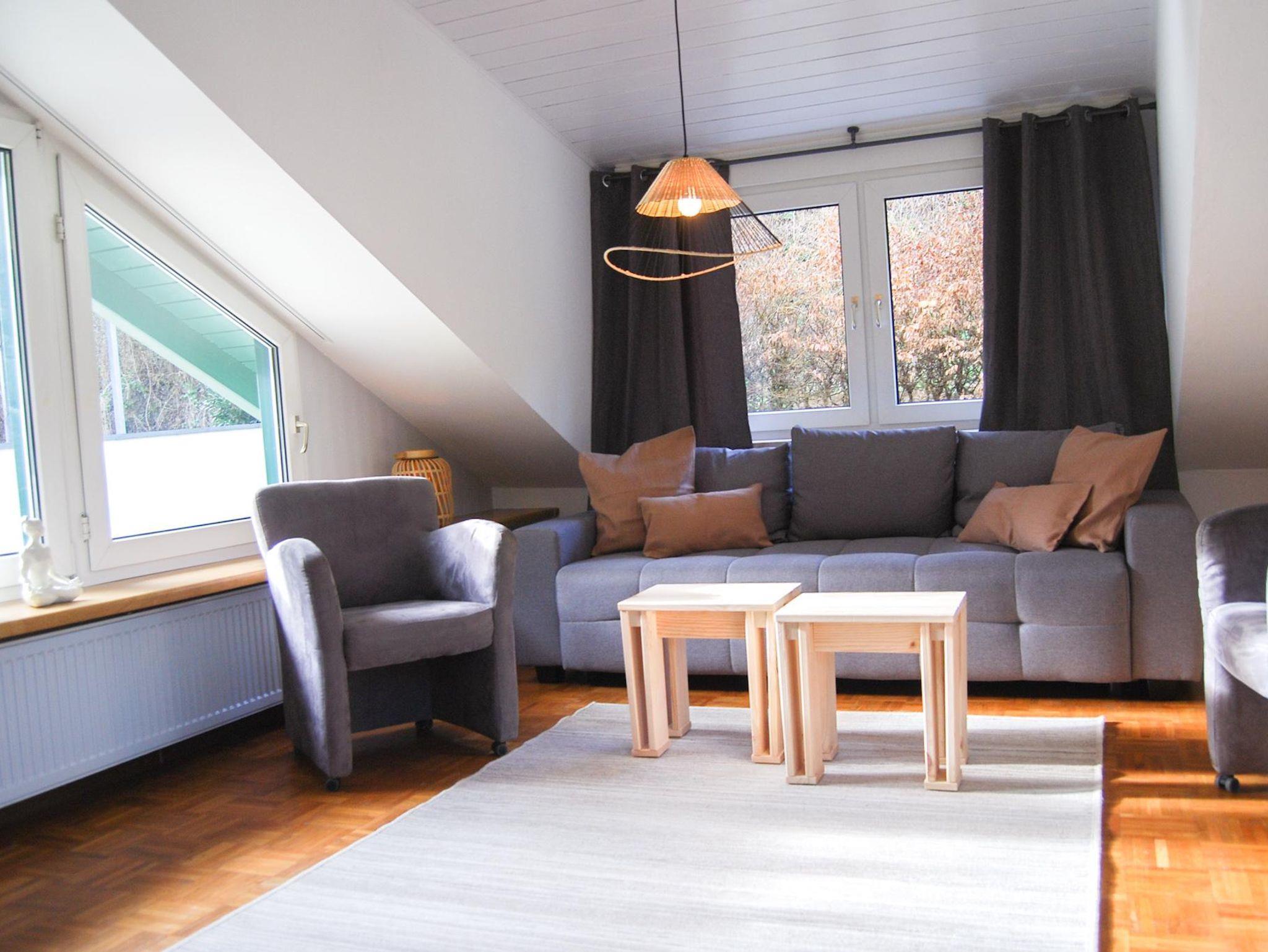 Auf dem Ausziehsofa im Wohnzimmer können zwei weitere Gäste Platz finden.