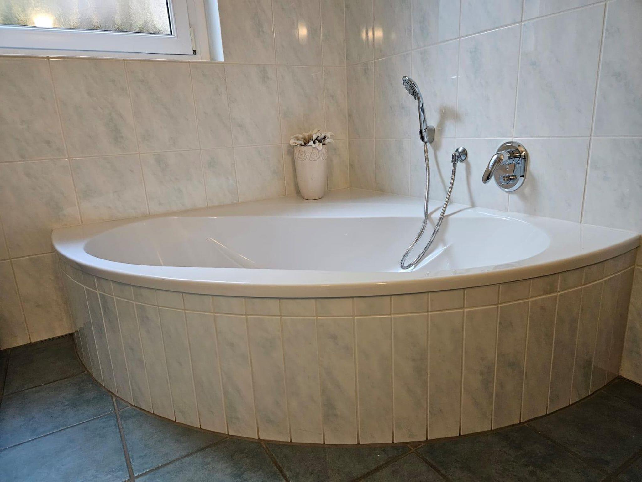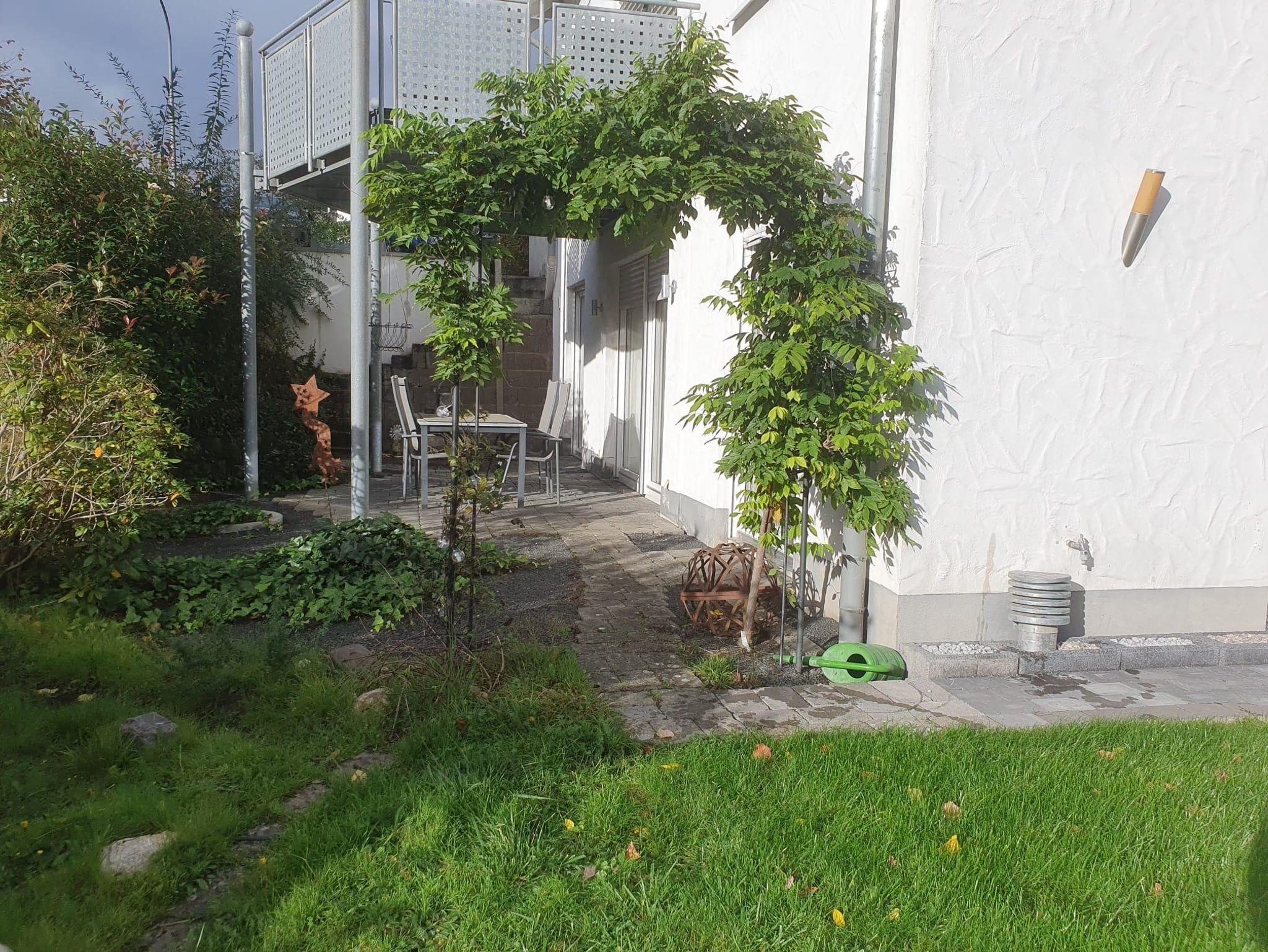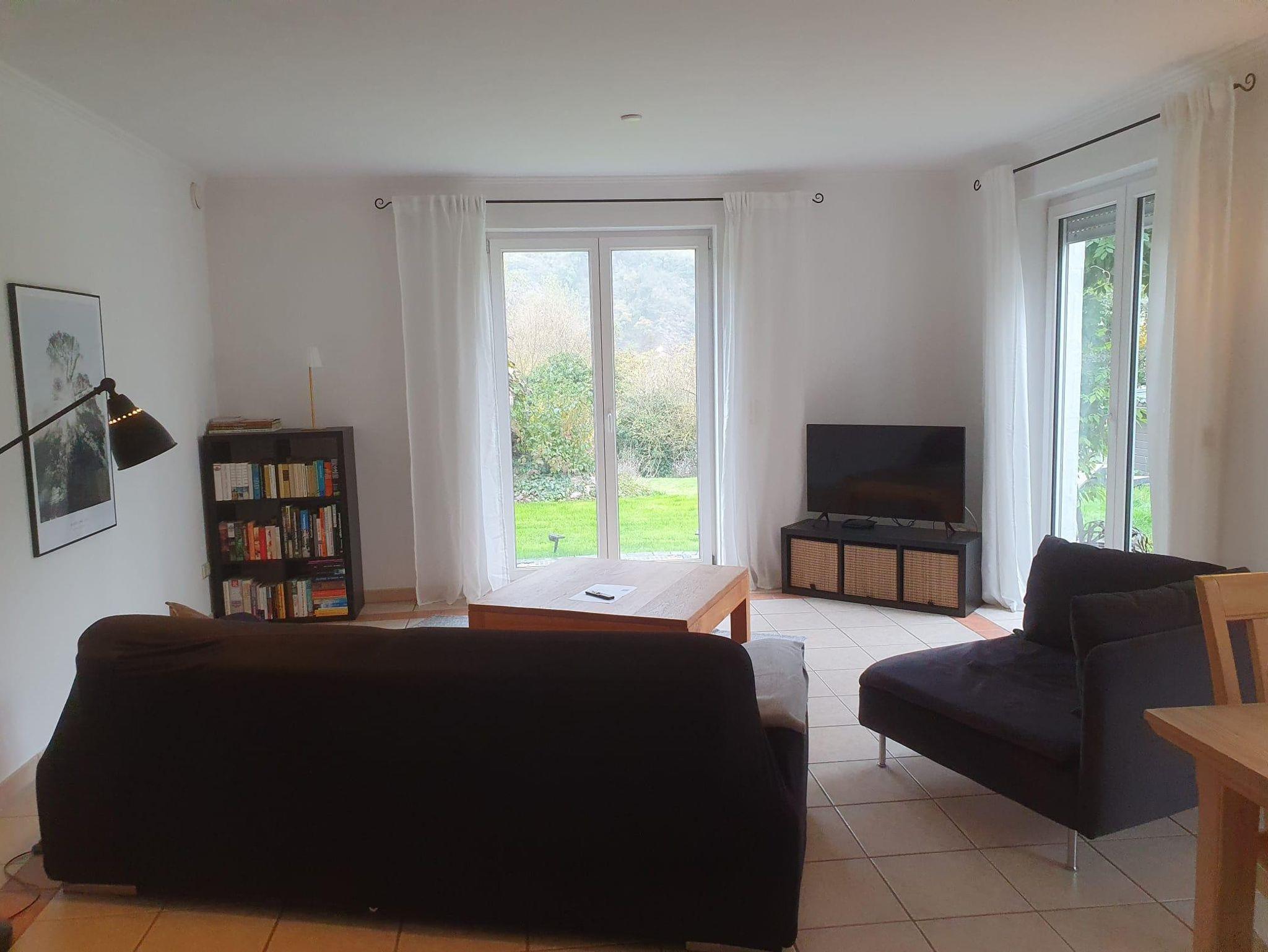Geräumige Souterrainwohnung mit eigenem Eingang, großem Wohnzimmer, zwei Bädern, Terrasse und Parkplatz.