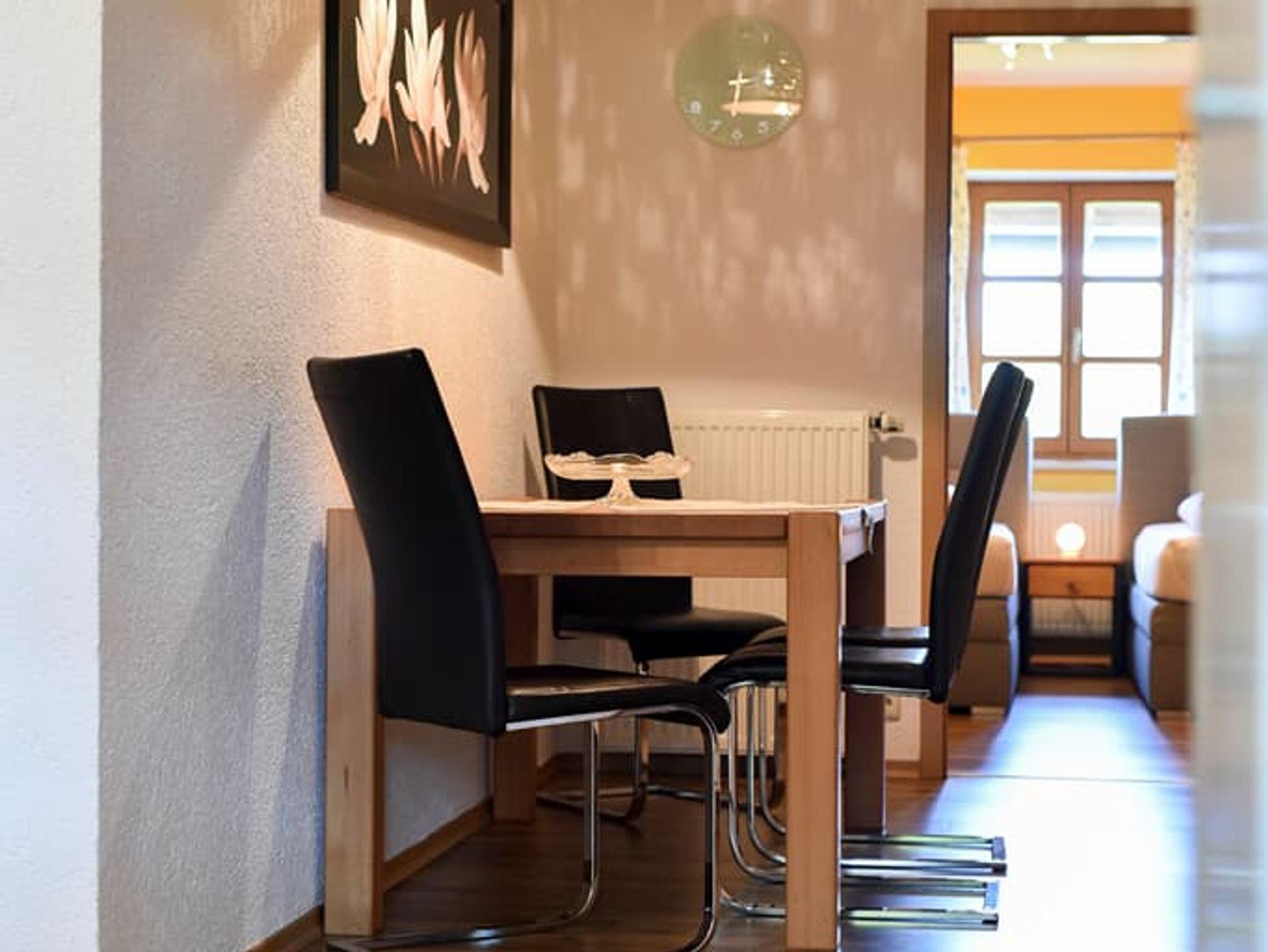 Große, gemütliche, renovierte Ferienwohnung Nr.1 (70qm, Erdgeschoß) mit Terrasse. Bestens geeignet für zwei Erwachsene und zwei Kinder oder vier Erwachsene. Die zwei Schlafzimmer sind mit Boxspringbetten samt offenem Fußteil ausgestattet die bei Ihrer Anreise bezogen sind. Das Elternschlafzimmer Doppelbett, das Kinderschlafzimmer mit getrennte Betten. Die offen gestaltete Küche läd zum gemeinsamen kochen ein. Hier finden Sie einen großen Kühl/Gefrierschrank sowie eine Spülmaschine, einen Backofen mit Cerankochfeld. Ebenfalls erleichtern eine Kaffeemaschine und Wasserkocher, ein Toaster und ein Handrührgerät die Menüzubereitung. Spül- und Geschirrtücher sind in der Wohnung bereitgelegt. Die Wohnküche ist mit einer praktischen Esstischganitur für vier Personen eingerichtet. Das geräumige Wohnzimmer mit gemütlicher Couch läd bei TV und Musikanlage zum entspannen ein. Im Bad mit Badewanne/Dusche inklusiv und WC liegen Hand- und Badetücher sowie ein Fön bereit. In der großen Scheune findet sich genung Platz für eine kostenlose Unterstellung der Fahrräder und Motorräder.