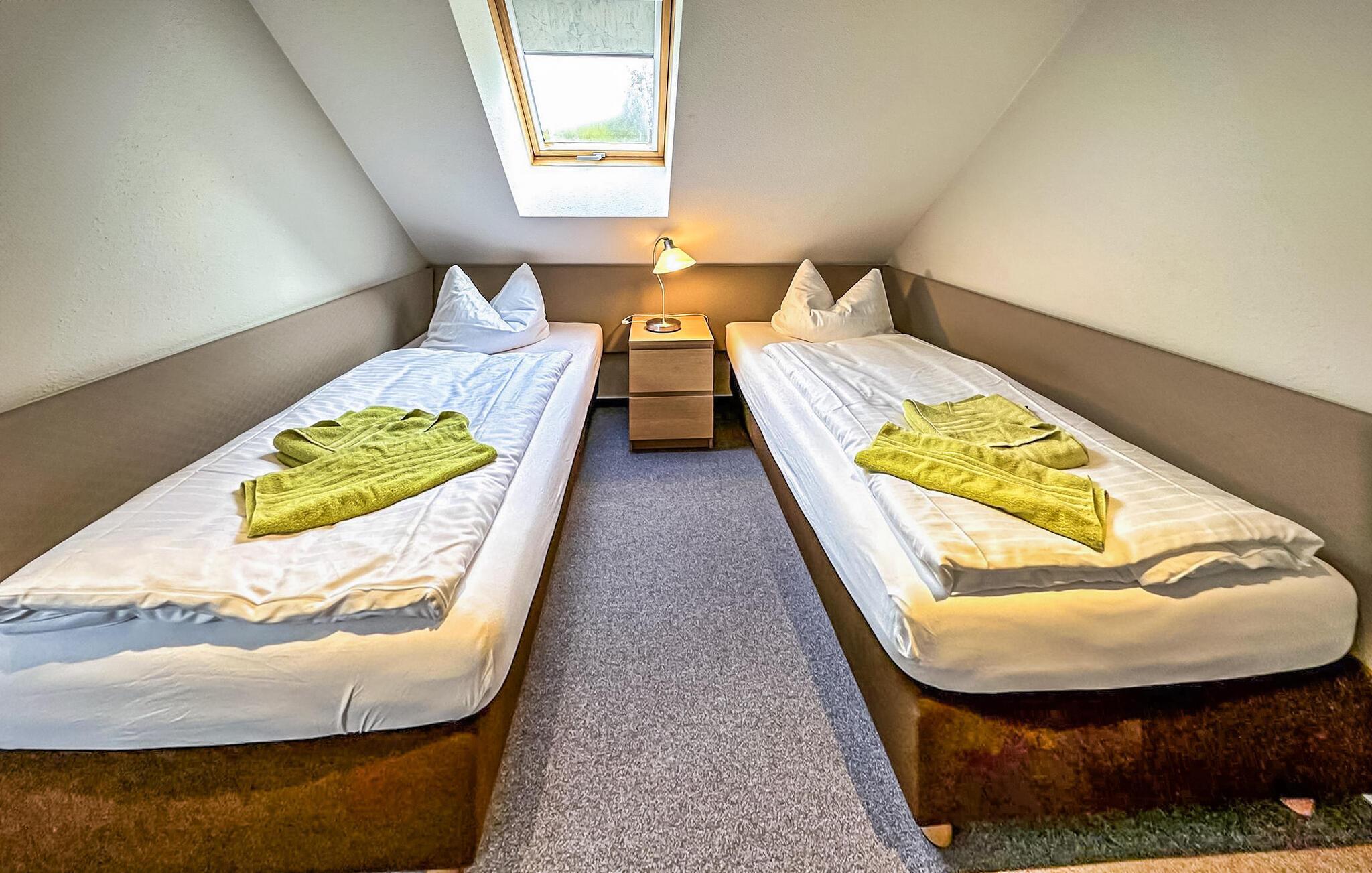 Die 3-Zimmer-Wohnung mit 62 qm für 4 Personen liegt im Ober- bzw. Dachgeschoss und ist über eine zentrale Treppe erreichbar. Es verfügt über ein Wohnzimmer mit Esstisch und offener Küchenzeile (Polstermöbel, Flachbild-TV, Esstisch, Elektroherd, Backofen, Kühlschrank mit Gefrierfach, Mikrowelle, diverse Küchengeräte), ein Badezimmer mit Dusche/WC und ein Schlafzimmer mit Doppelbett (Durchgangszimmer zum Badezimmer). Über eine platzsparende Treppe gelangt man in einen weiteren Wohn-/Schlafbereich mit 2 Einzelbetten, TV und Sitzgelegenheit. Es gibt auch einen möblierten Balkon. Für Kleinkinder kann ein Kinderbett und ein Hochstuhl bereitgestellt werden. WLAN ist ebenfalls verfügbar. Für jede Wohnung auf dem Grundstück stehen ein Parkplatz, Fahrradständer und ein zentraler Grillplatz auf dem Nachbargrundstück zur Verfügung.