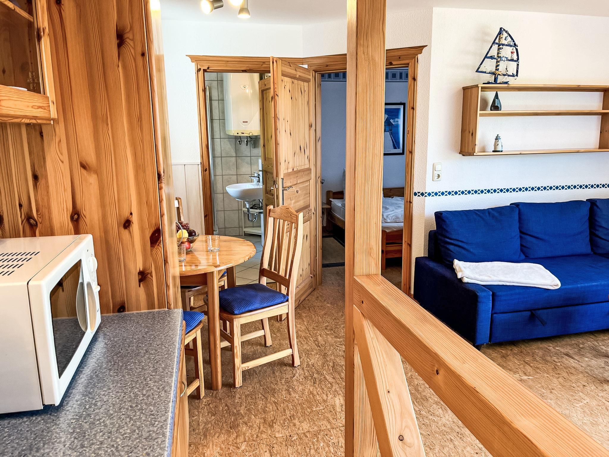 "Emma", 2-Zimmer-Bungalow 34 m2. Objekt geeignet für 2 Erwachsene + 1 Kind. 1 Zimmer mit Esstisch, Küchenblock und Sat-TV (Flachbildschirm), Radio. Ausgang zur Terrasse. 1 Zimmer mit 1 Doppelbett (180 cm, Länge 200 cm). Wohnküche (2 Kochplatten, Toaster, Wasserkocher, Mikrowelle, elektrische Kaffeemaschine). Dusche/WC. Fussbodenheizung. Terrasse. Terrassenmöbel. Zur Verfügung: Internet (WLAN, gratis). Parkplatz (überdacht, 1 Auto). Bitte beachten: geeignet für Familien. Nichtraucher-Unterkunft. Rauchmelder.
