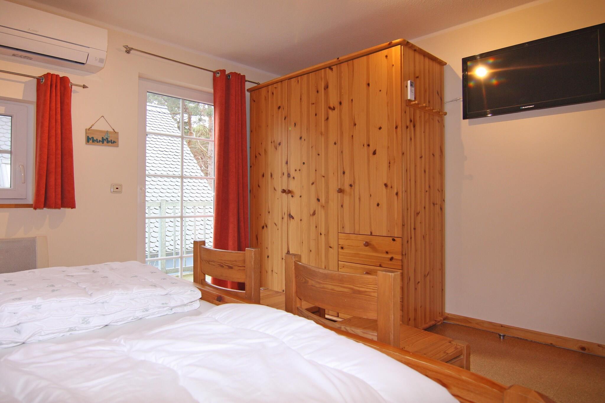 Parterre: (offene Küche(Esstisch(8 Personen), Wasserkocher, Toaster, Kochherd(4 Kochplatten, Ceranfeld), Dunstabzugshaube, Kaffeemaschine, Backofen, Mikrowelle, Spülmaschine, Kühlschrank(+ Gefrierfach)), Wohn/Esszimmer(TV(Satellit), Radio, CD-Spieler, Heizung(Fußbodenheizung), Heizung(elektrisch)), Schlafzimmer(Doppelbett), Badezimmer(Dusche(ebenerdige Dusche), Waschbecken, Toilette, Waschmaschine), Flur) In der 1. Etage: (Schlafzimmer(Doppelbett, TV, Klimaanlage), Schlafzimmer(2x Einzelbett(90 x 200 cm, 90 x 210 cm), TV), Badezimmer(Dusche, Sauna(alleinige Nutzung), Waschbecken, Toilette), Flur) Dachgeschoss: (open sleeping areas(Einzelbett), Einzelbett, TV, Klimaanlage) Balkon, Balkon, Terrasse, Fahrradabstellraum, Gartenmöbel, Grill, Parkplatz, Parkplatz, Hochstuhl, Außenkamin, Babybett (kostenpflichtig), Handtücher geben Gebühr, Bettwäsche gegen Gebühr