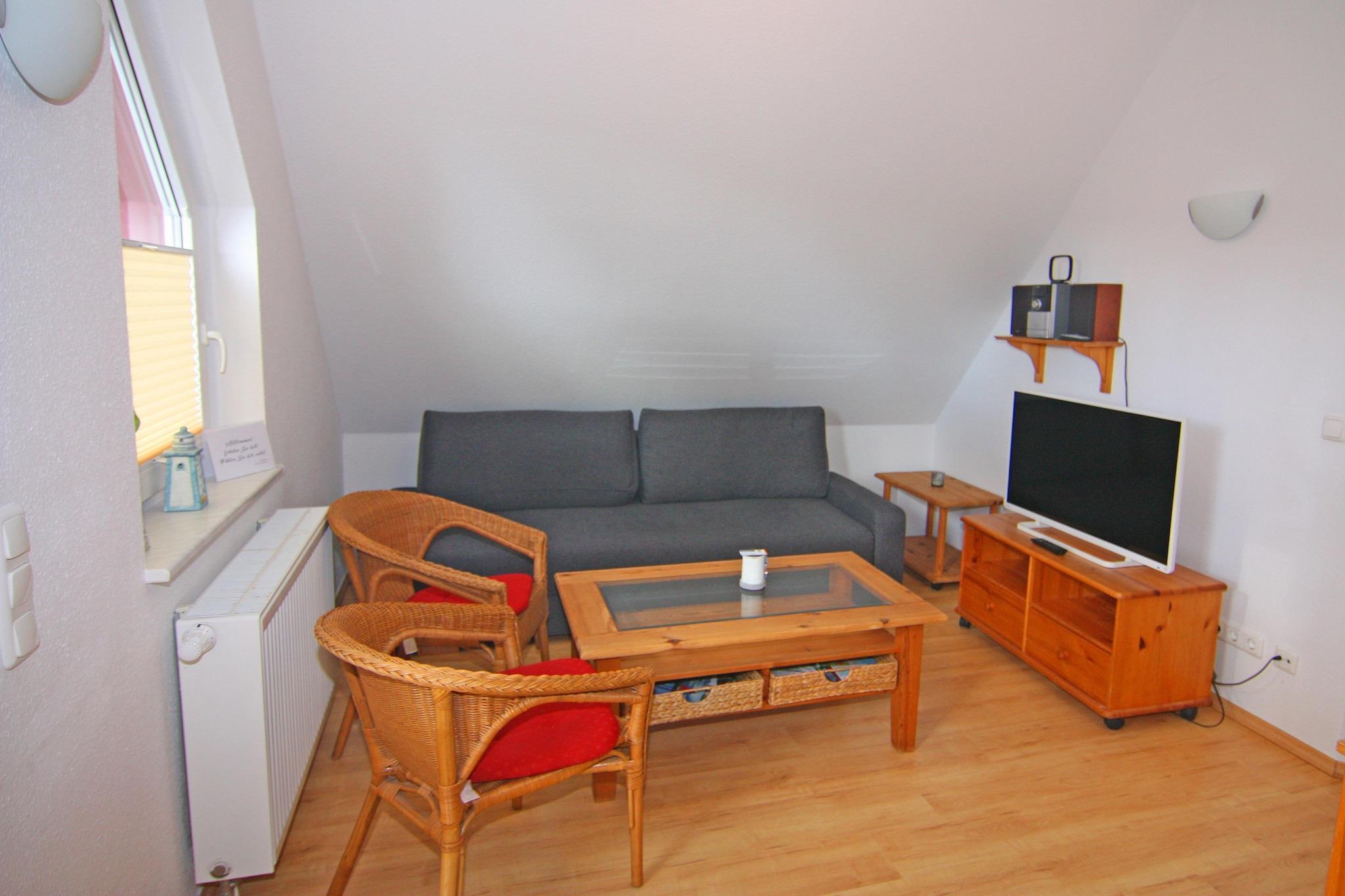 In der 1. Etage: (offene Küche(Esstisch(4 Personen), Kochplatte(4 Kochplatten, Ceranfeld), Wasserkocher, Toaster, Kaffeemaschine, Backofen, Mikrowelle, Kühlschrank(+ Gefrierfach)), Wohn/Esszimmer(Doppelschlafcouch, TV(Satellit), Radio, CD-Spieler), Schlafzimmer(Doppelbett), Badezimmer(Dusche, Waschbecken, Toilette)) Zentraler Grill, Sitzecke, Sauna(Gemeinschaftliche Nutzung mit anderen Gästen, gegen Gebühr), Balkon, Heizung(Gas), Gartenmöbel, Grill, Parkplatz, Babybett (kostenpflichtig), Handtücher/Bettwäsche (extra Gebühr)