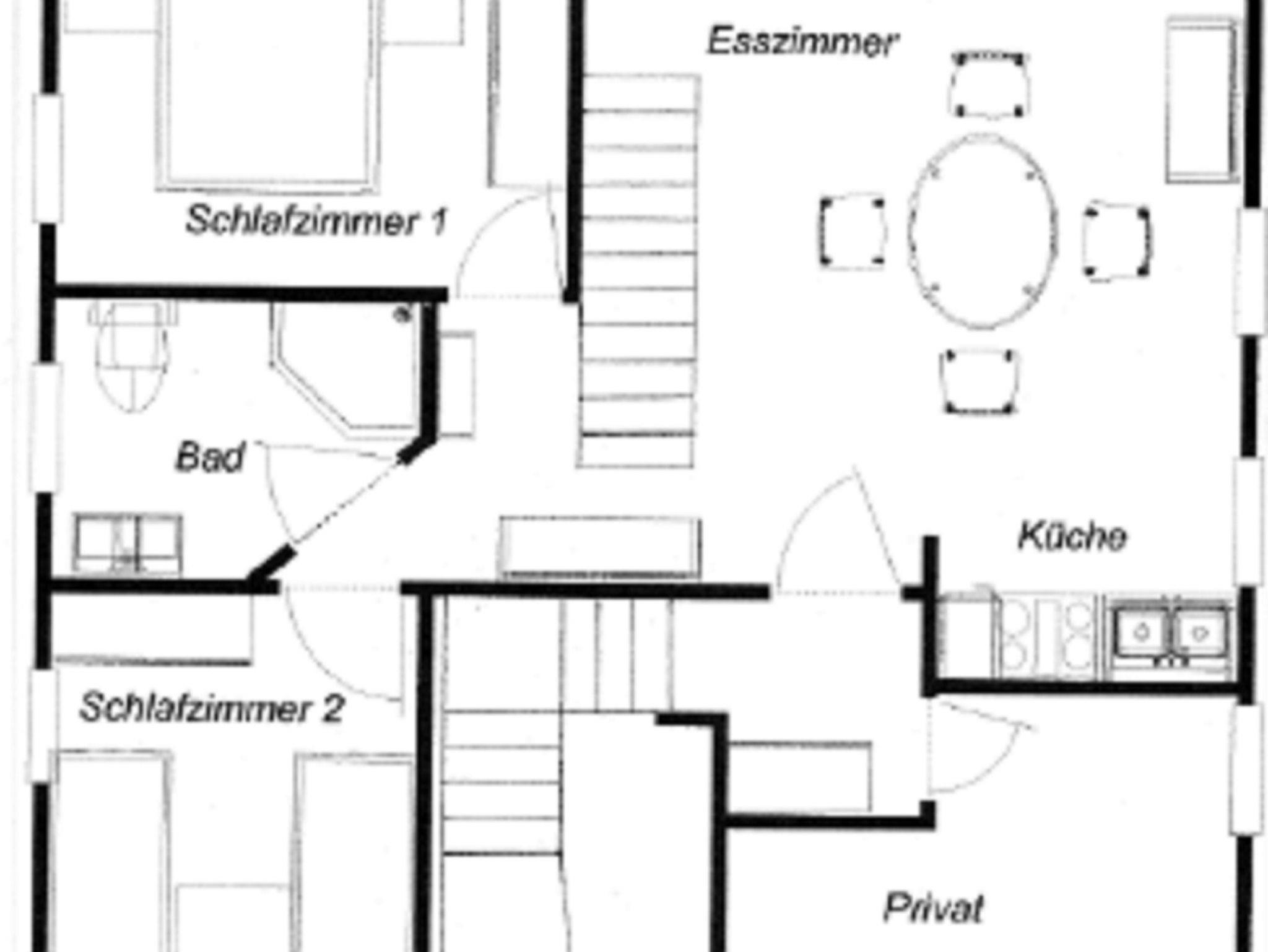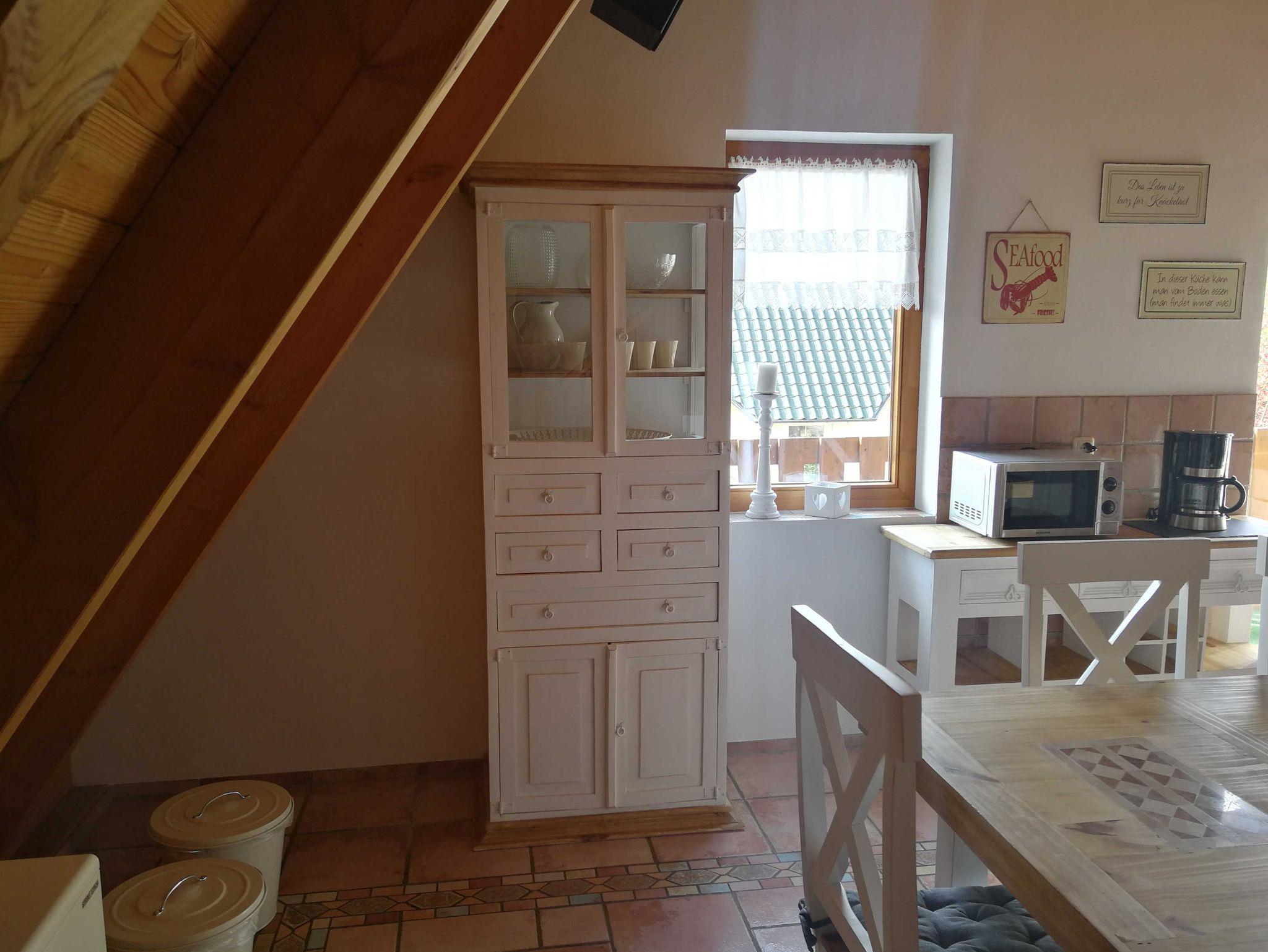 Die Ferienwohnung verfügt über zwei Etagen. Im 1.OG befinden zwei Schlafräume, Bad mit Dusche und einer modernen Küche mit großem Essbereich. In der Küche sind Kühlschrank, Geschirrspüler, Herd mit Ceranfeld und Backofen, Mikrowelle, Eierkocher, Kaffee - und Espressomaschine, Toaster, Waffeleisen, Mixer, Wasserkocher, Elektrogrill und reichlich Koch - und Essgeschirr vorhanden.