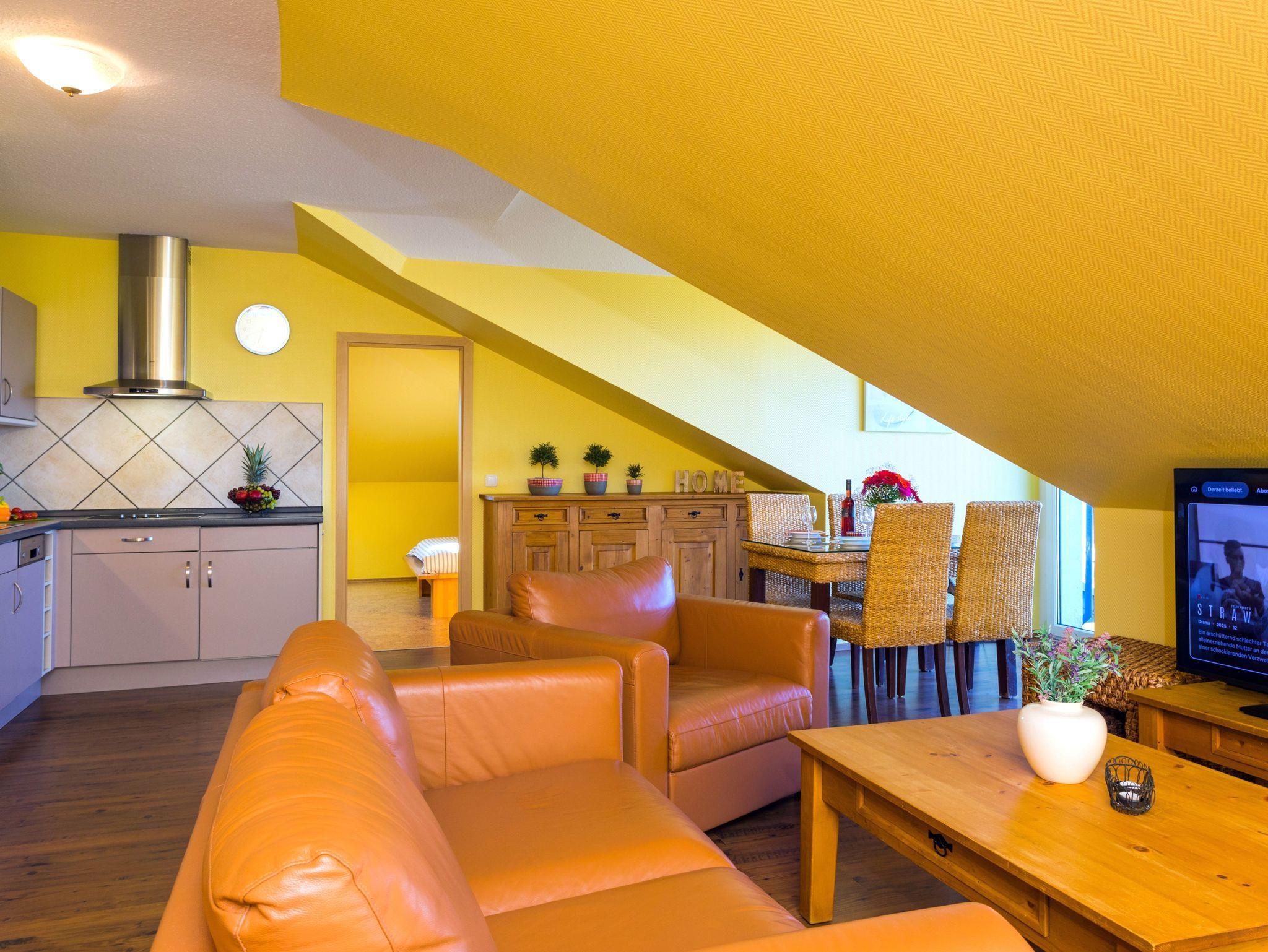 • Wohnraum mit Couch und Sessel, Flachbild-TV mit ca. 100cm Bilddiagonale, Internet-WLAN, Radio und DVD