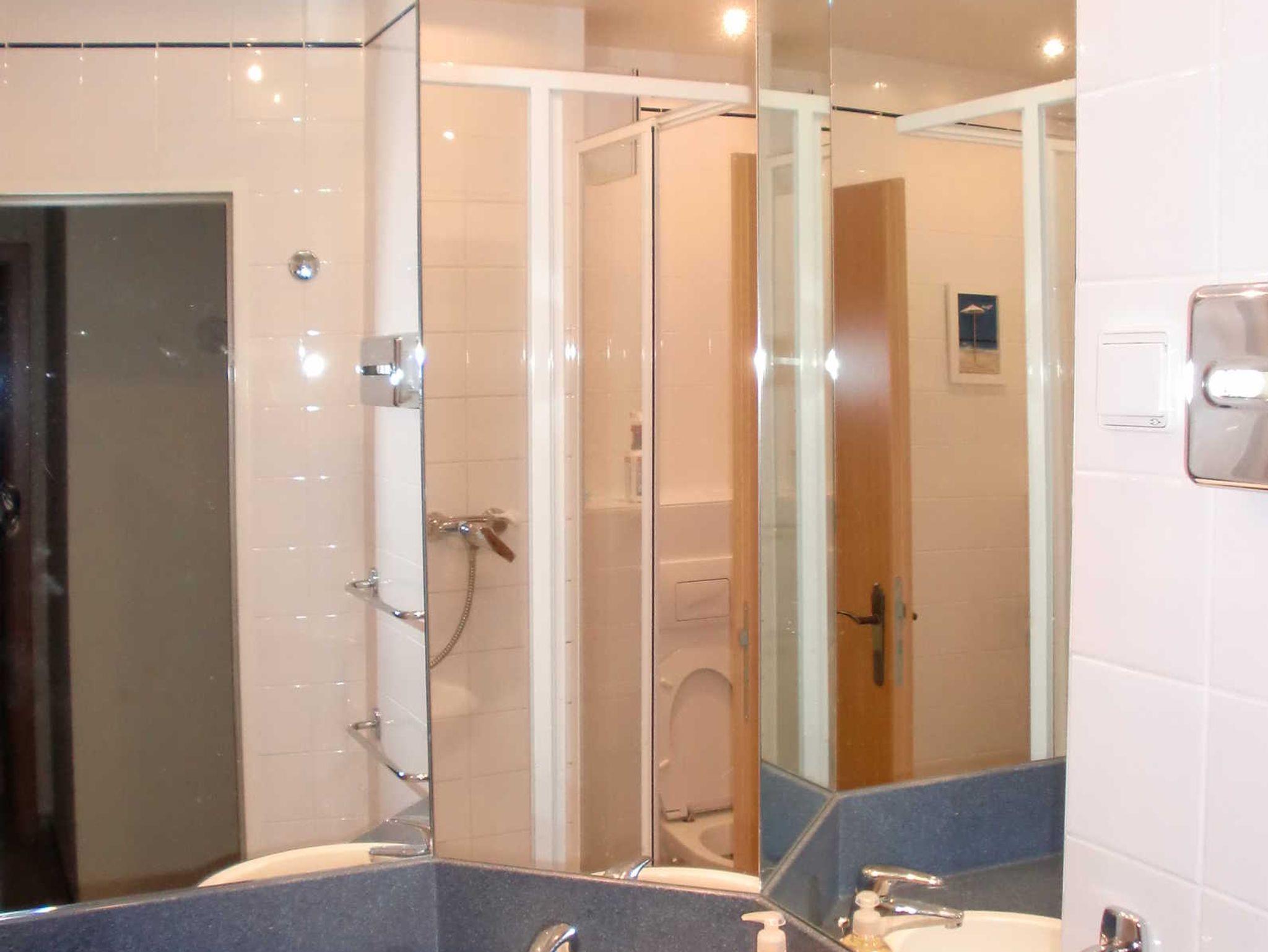 In einem Schlafzimmer steht ein Doppel- und im anderen zwei Einzelbetten. Das Bad hat ein Waschbecken mit Toilette, einen großen Spiegel und eine geräumige Dusche. Das alles liegt im Erdgeschoß mit einer schönen Terrasse und entsprechenden Gartenmöbeln. Zu dieser Wohnung gehört der Parkplatz Nr. 10.