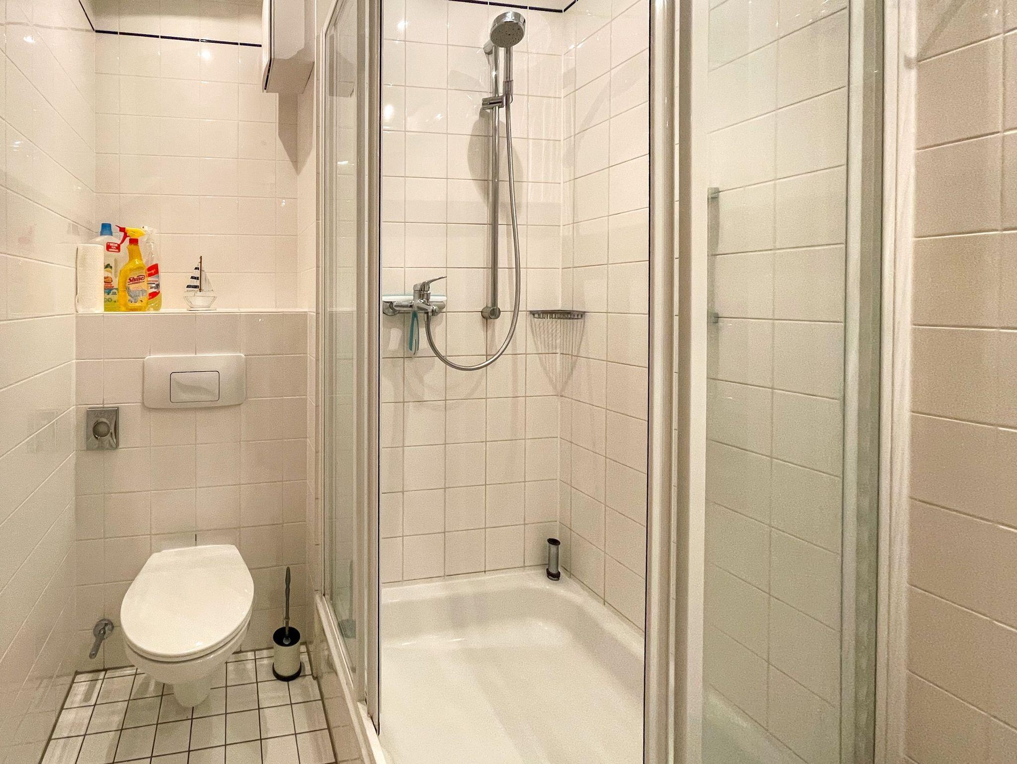 Zuletzt kommen Sie vom Flur in das Badezimmer, ausgestattet mit einer Dusche, einem WC und einem Waschbecken.