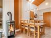 Der offene Wohnbereich mit Kaminofen bildet das Herzstück des Hauses. Hier lässt es sich zu jeder Jahreszeit angenehm verweilen im Sommer mit direktem Terrassenzugang, im Winter mit wohliger Wärme vom Kamin.