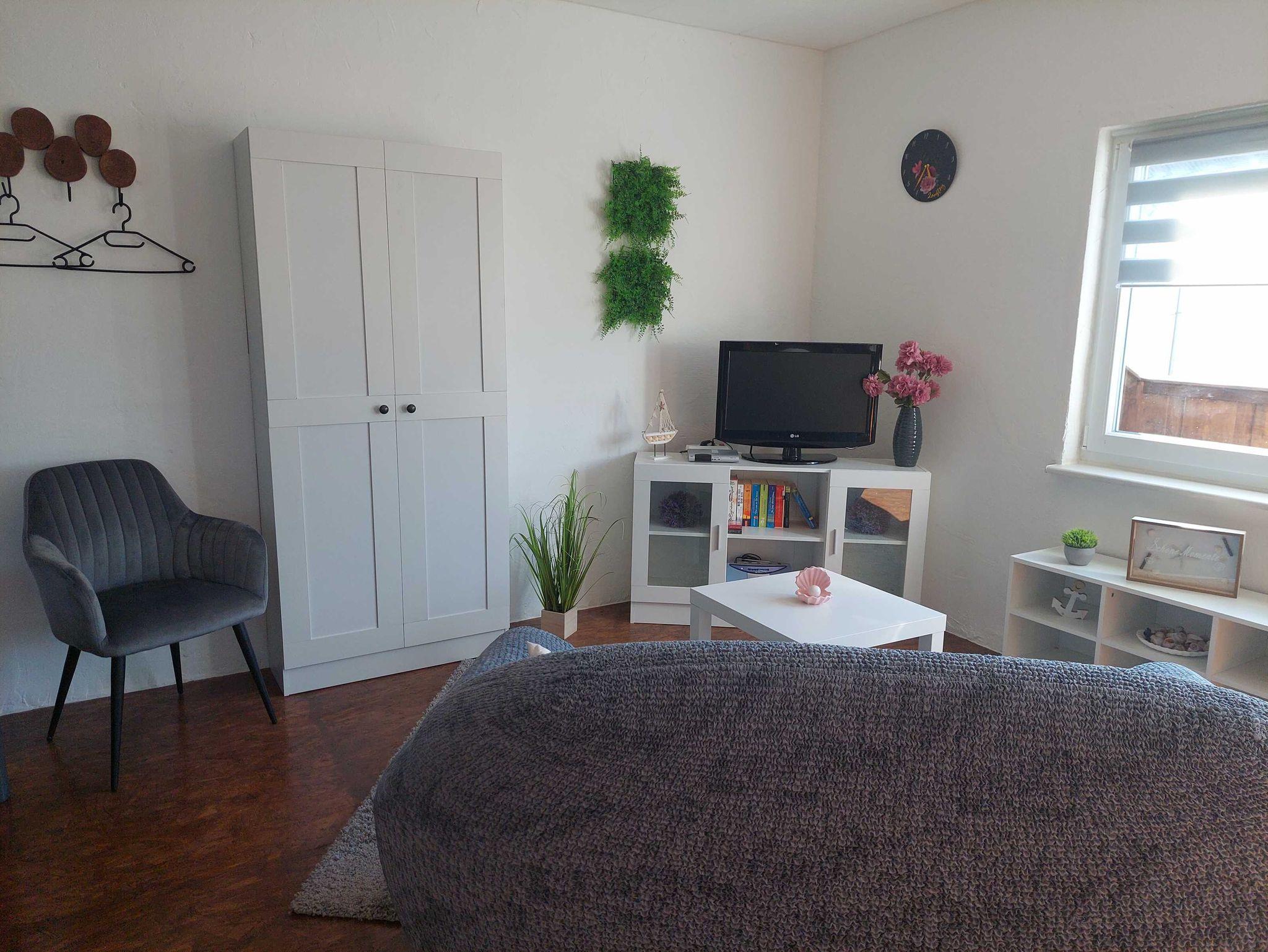 Der Wohn/Schlafraum verfügt über eine Couch, TV und Radio und einem Doppelbett.Bettwäsche wird von uns gestellt.