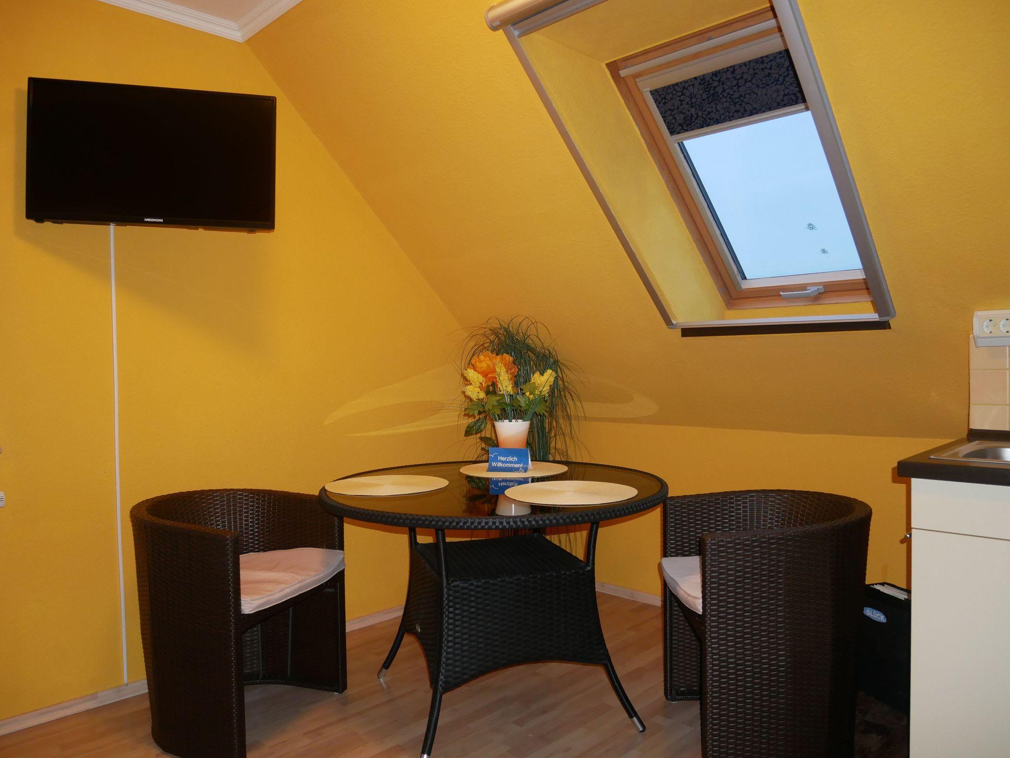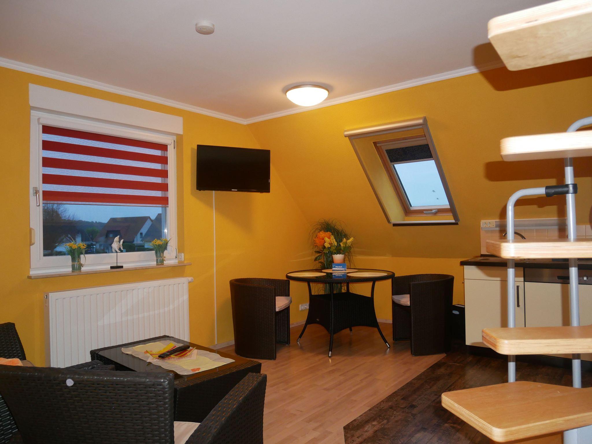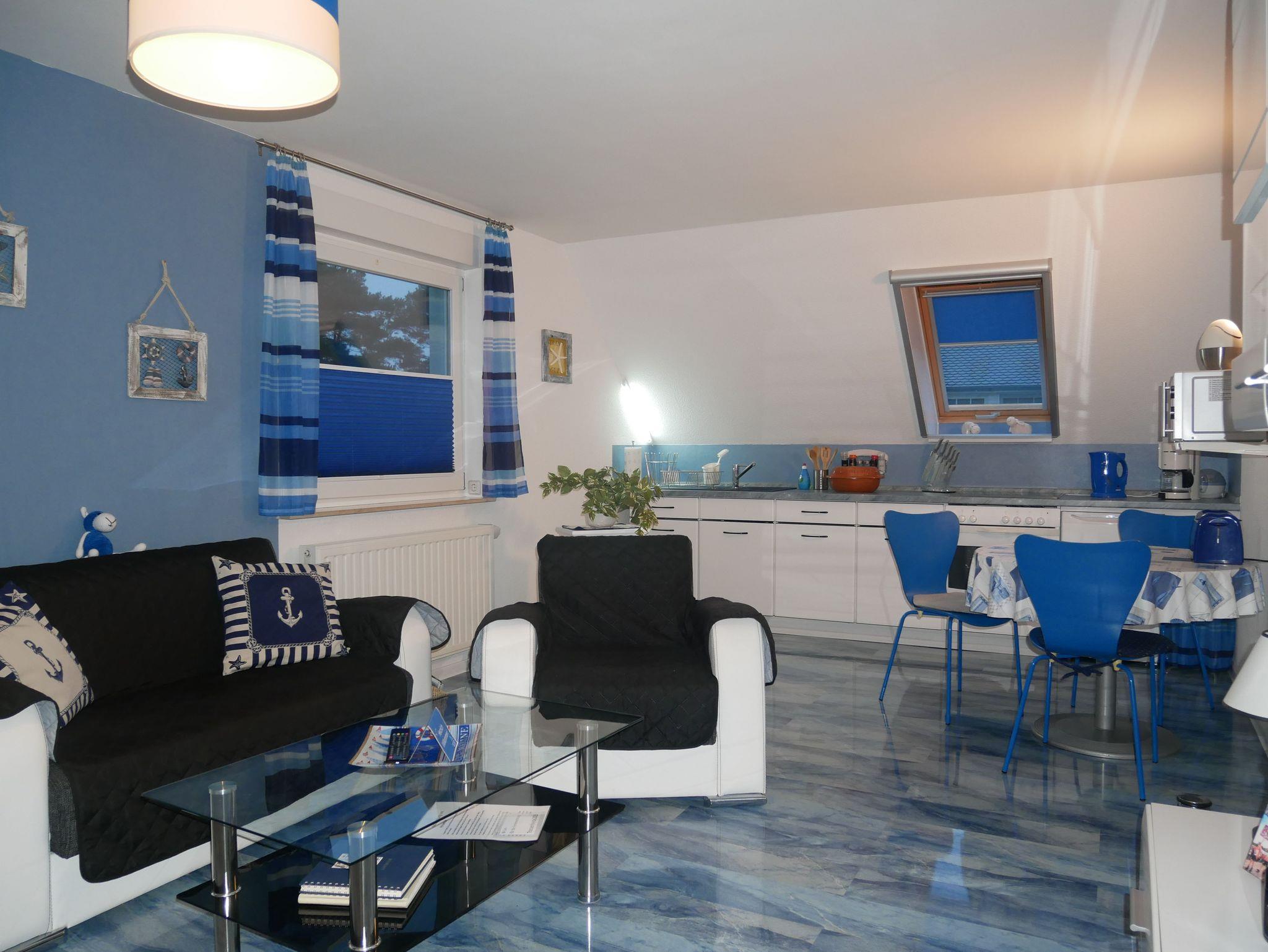 Der kombinierte Wohn- und Schlafraum verfügt über eine gemütliche Wohnecke mit SAT/TV, einen optisch abgetrennten Schlafbereich mit Doppelbett und über eine offene Küchenzeile. Die Küche ist ausgestattet mit Kühlschrank, Gefrierfach, Herd, Backofen, Mikrowelle, Wasserkocher, Kaffeemaschine und Toaster.