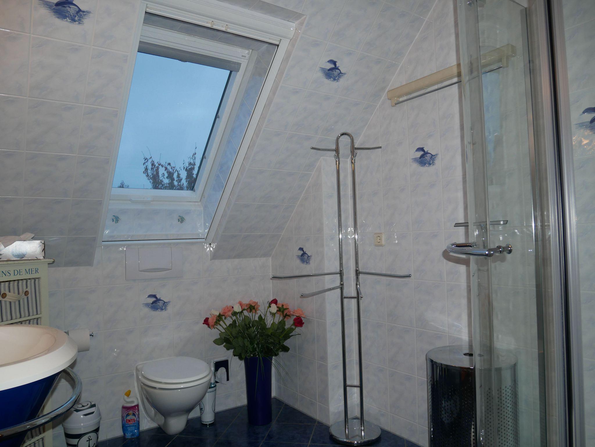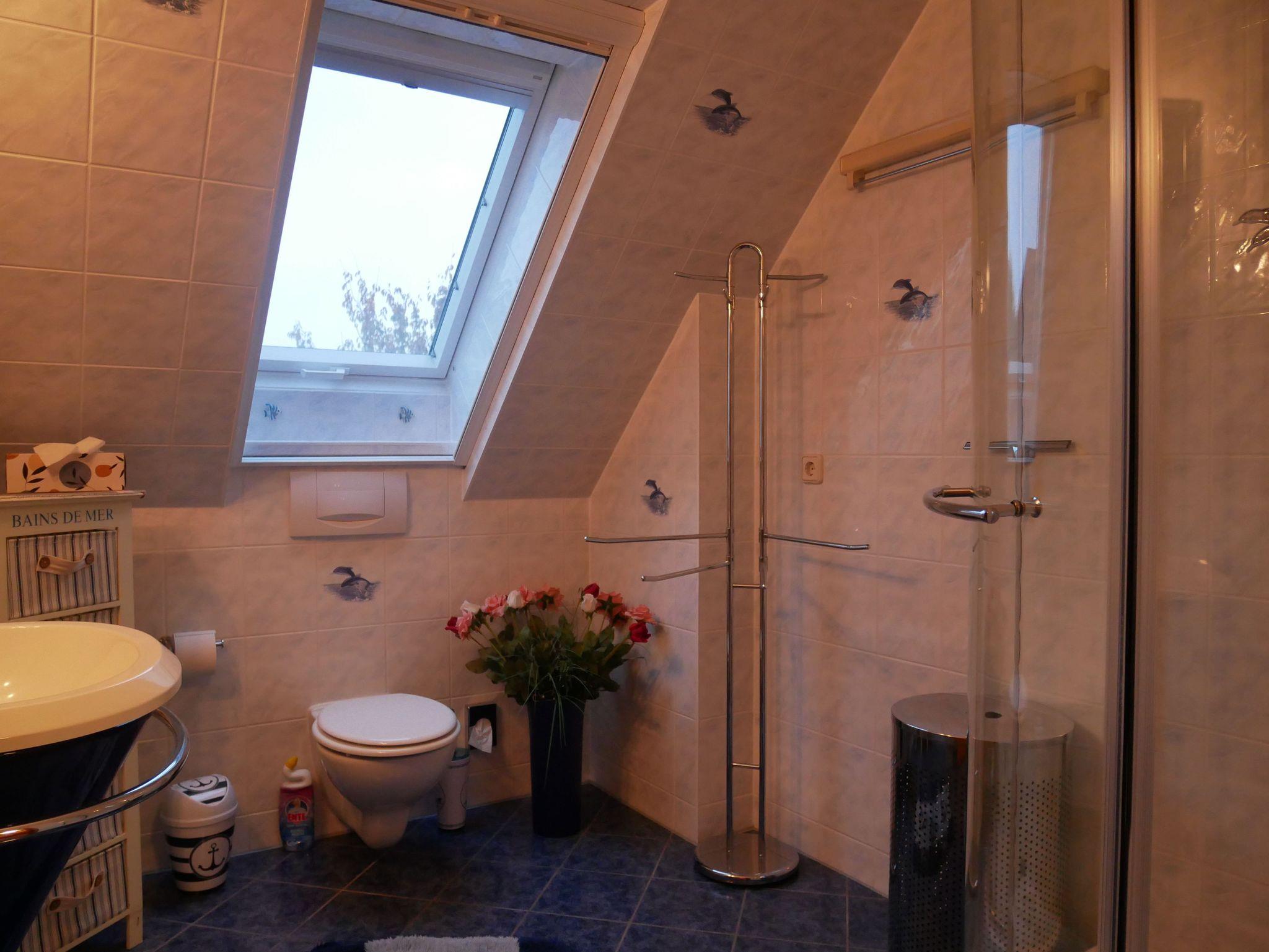 Das Badezimmer verfügt über eine Dusche, WC und Fön. Kleiderschränke sind im kombinierten Wohn- und Schlaufraum, sowie im Flur der Ferienwohnung vorhanden.