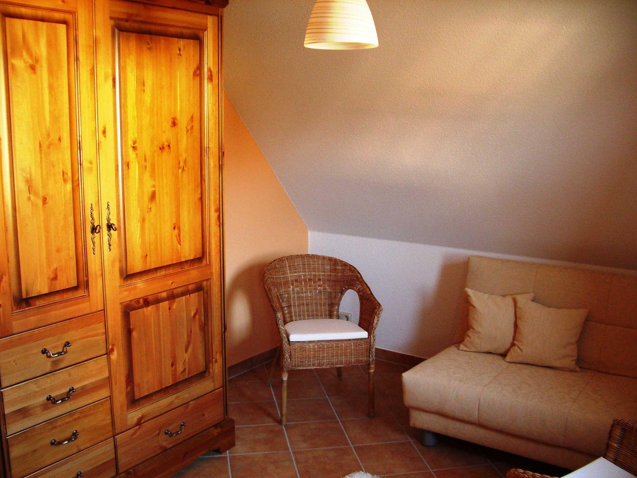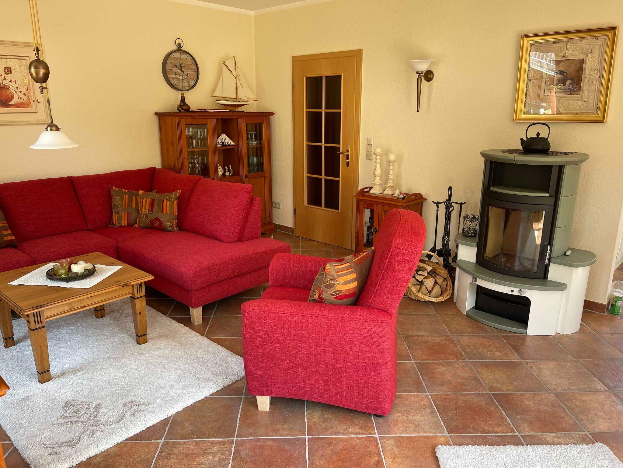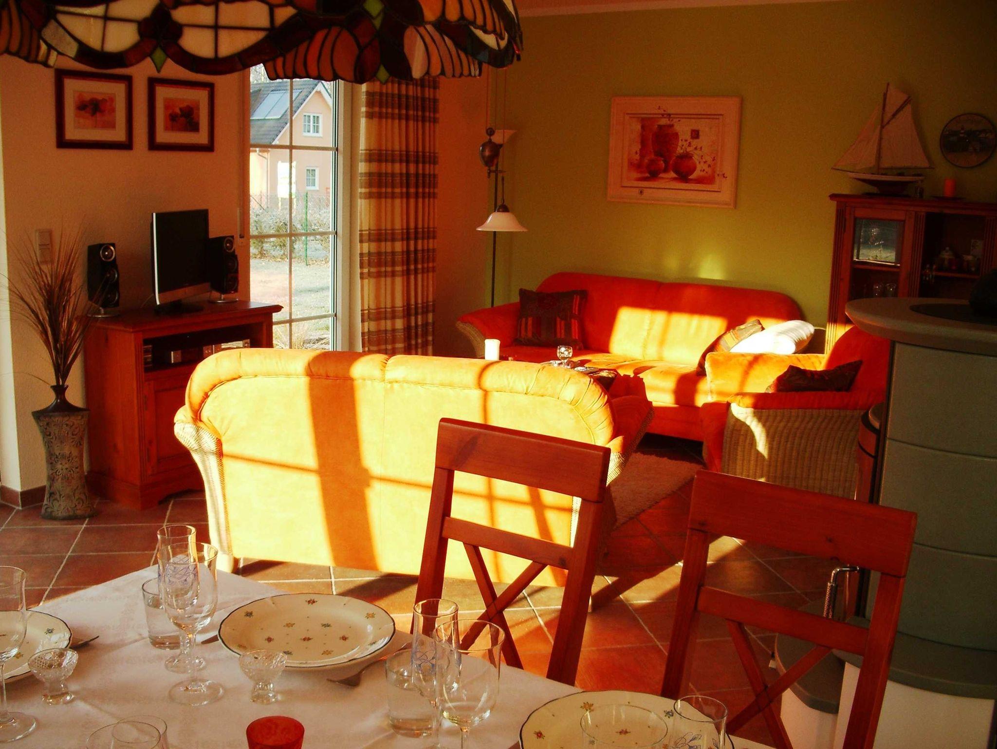 Urgemütliches Wohnzimmer mit Echtholzmöbeln, 2 Schlafzimmer, 2 Bäder, sonnige Terrasse, Garten, PKW-Stellplatz, Strandnähe.
