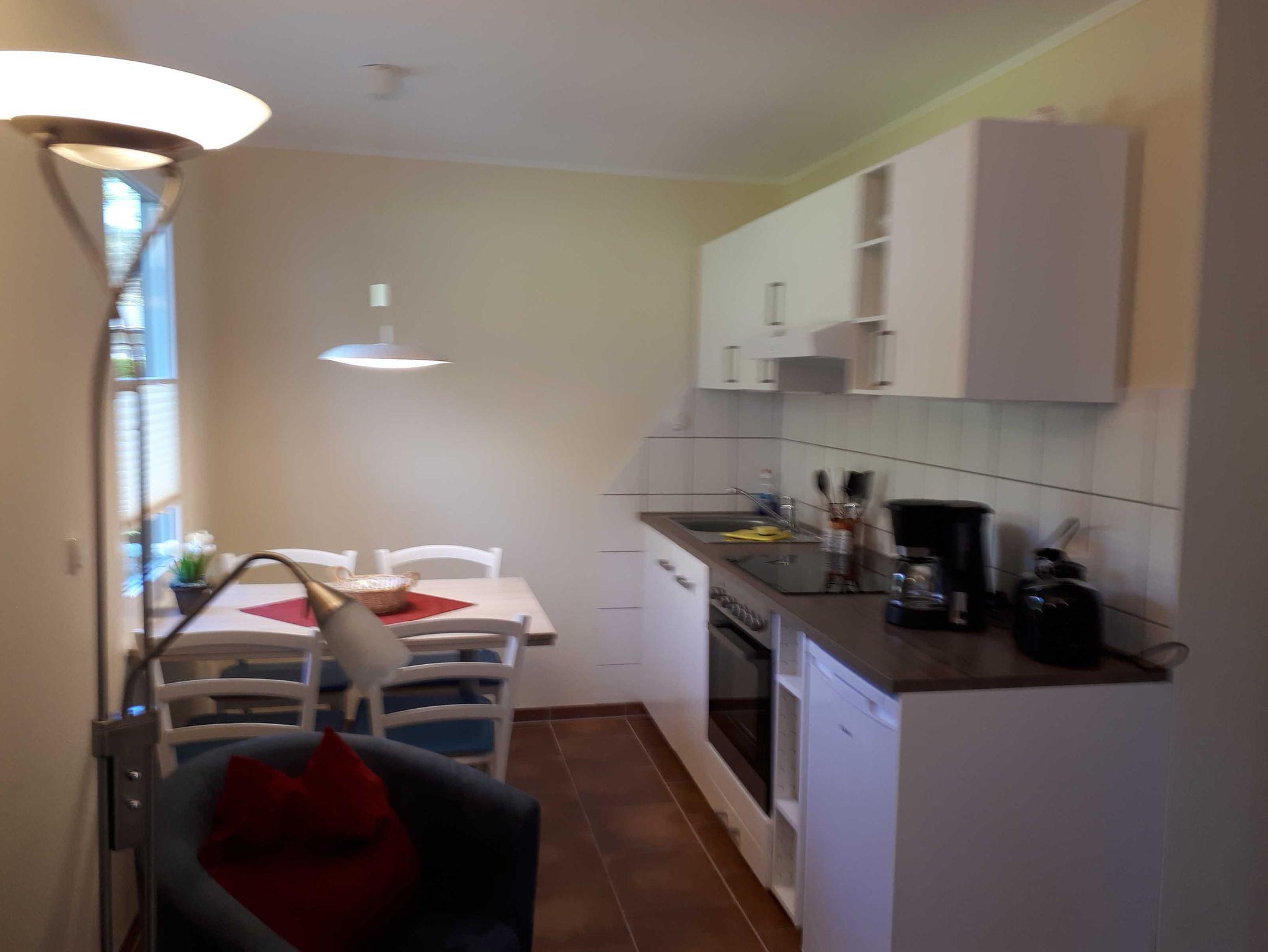 eine Küche mit Spülmaschine und Elektroherd (Backofen), sowie Wohnzimmer mit SAT/TV-Radio.
