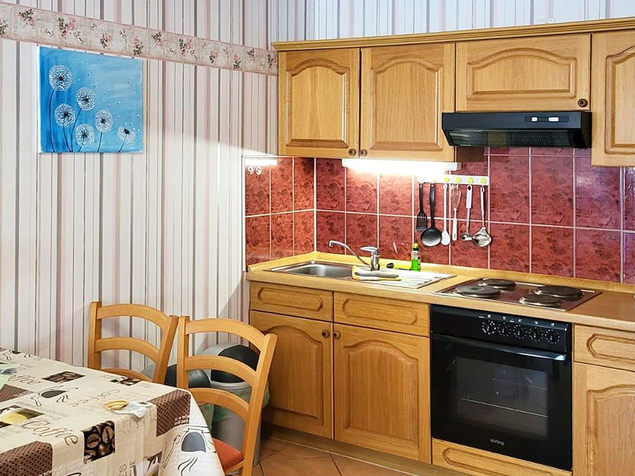 Küche mit 4 Plattenherd, Mikrowelle, Kühlschrank, Kaffeemaschine, Toaster,