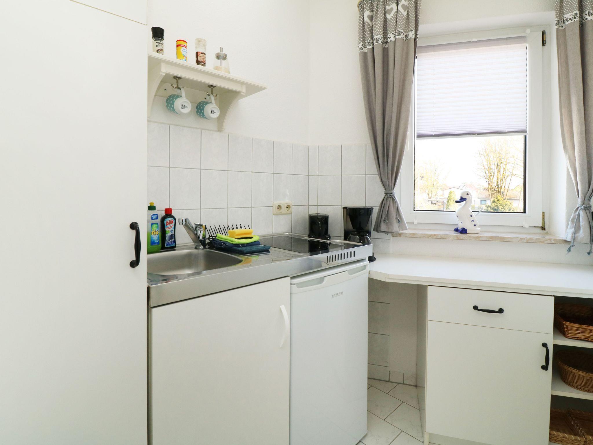 einem Kühlschrank mit Gefriermöglichkeit und einer kompletten Küchenausstattung. Dazu gehören auch Kaffeemaschine, Wasserkocher und Toaster.