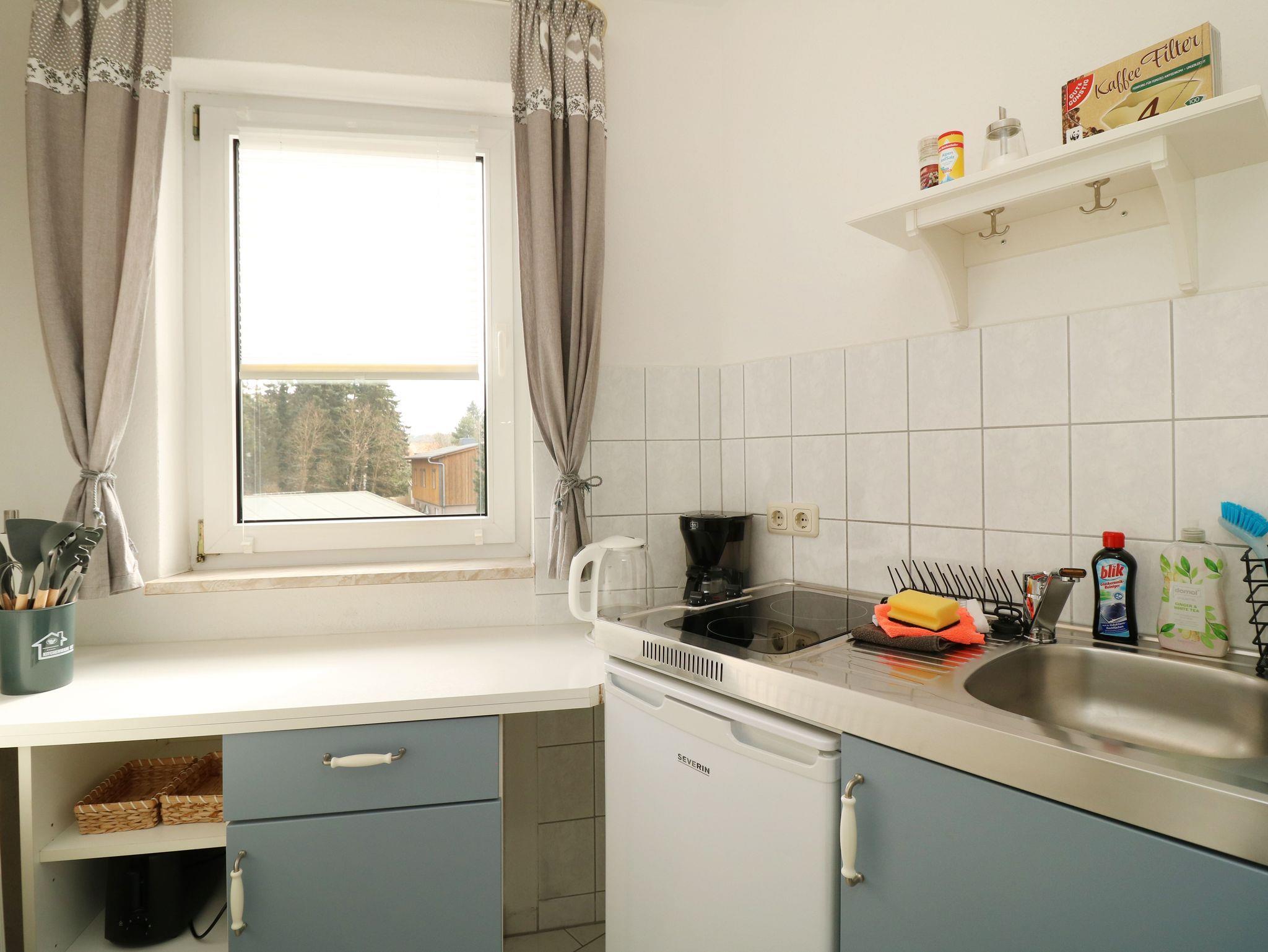 einem Kühlschrank mit Gefriermöglichkeit und einer kompletten Küchenausstattung. Dazu gehören auch Kaffeemaschine, Wasserkocher und Toaster.