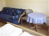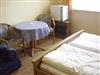 Zimmer mit Doppelbett und Einzelbett, bzw. Klappbett, Tisch und 3 Stühlen. Es gibt einen Kleiderschrank und einen Minikühlschrank im Zimmer, ebenso wie einen Fernseher..