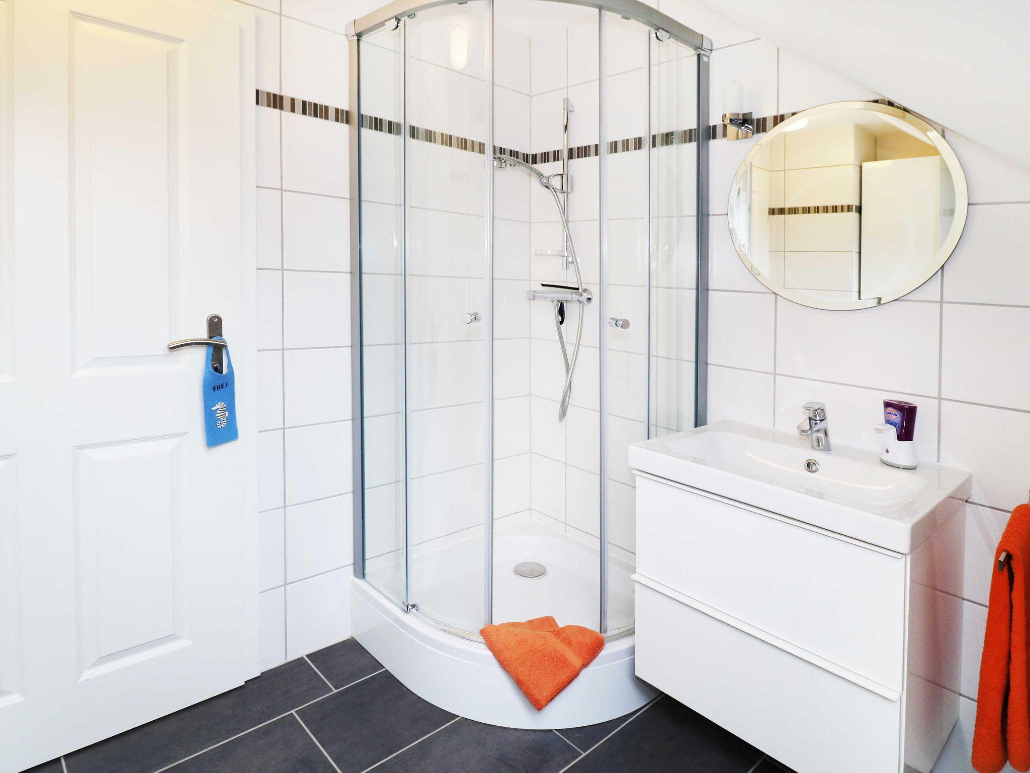Über den Flur gelangt man in das großzügige Badezimmer mit Waschbecken und WC sowie einer Dusche mit niedrigem Einstieg.