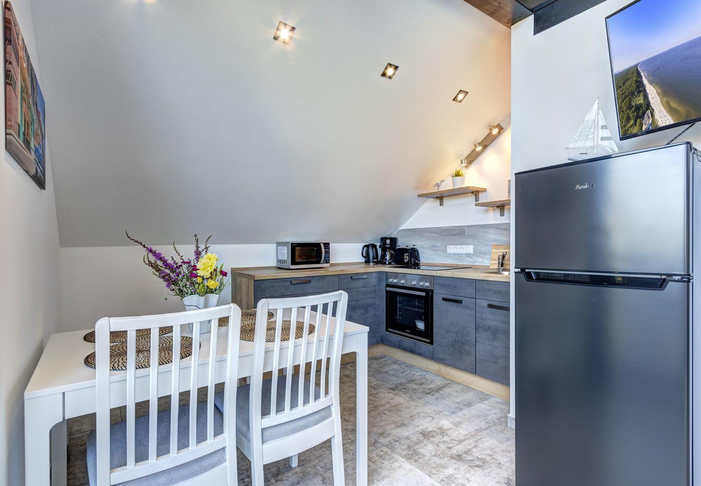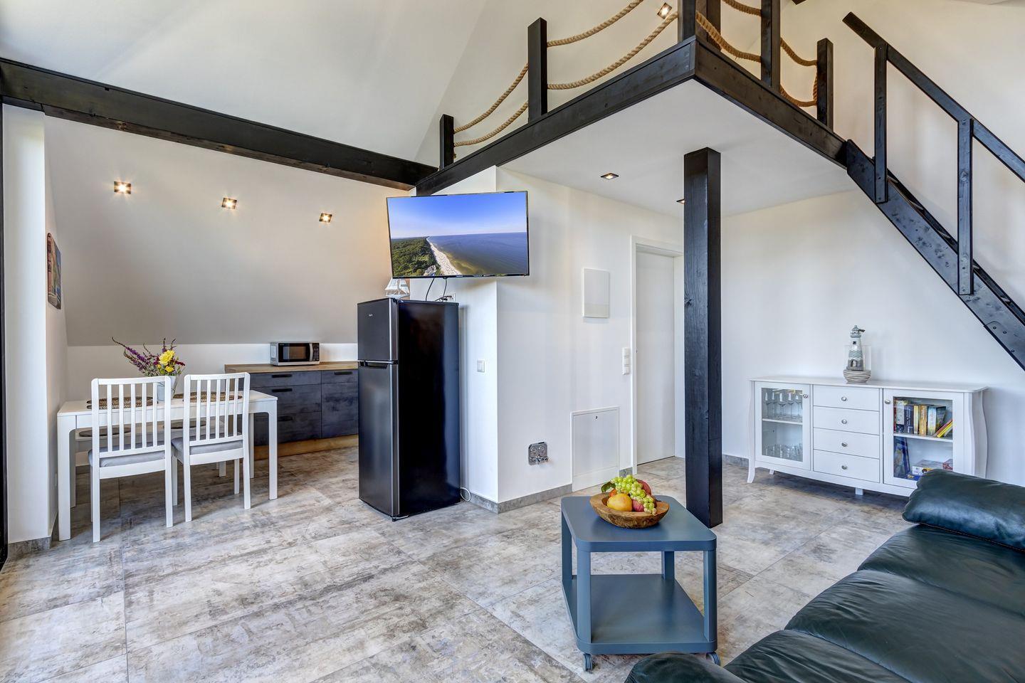 Sonnige Terrasse, vollausgestattete Küche im Wohnbereich, Schlafzimmer mit Doppelbett, Galerie mit 2 Schlafplätzen für Jugendliche - ein besonderes Urlaubsdomizil für Ihren Ostseeurlaub.
