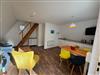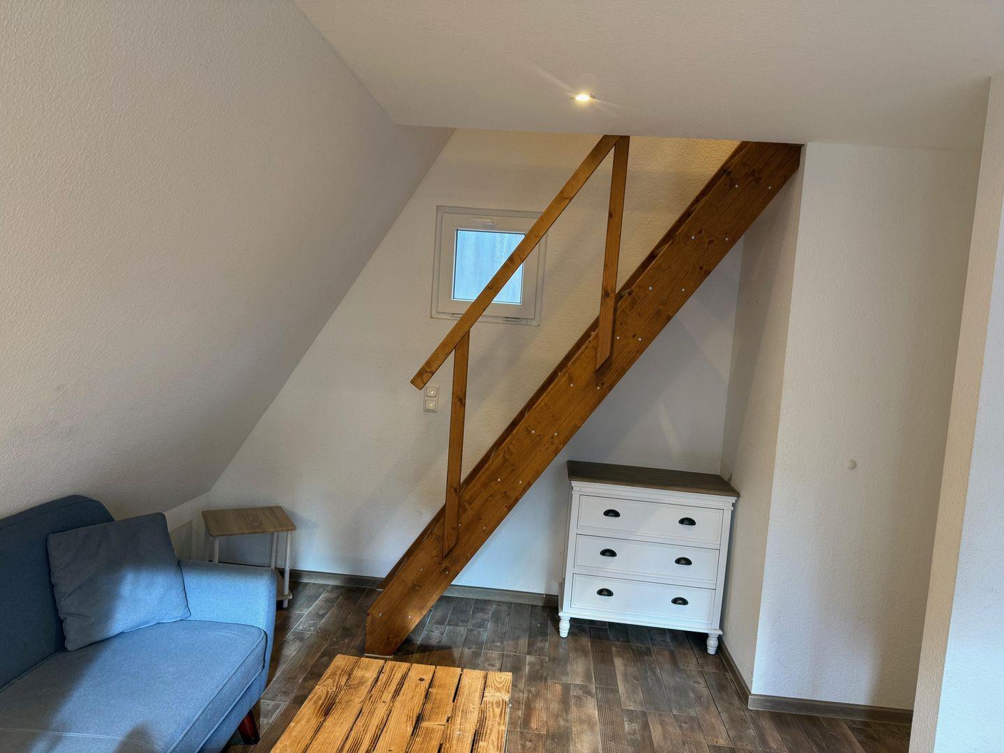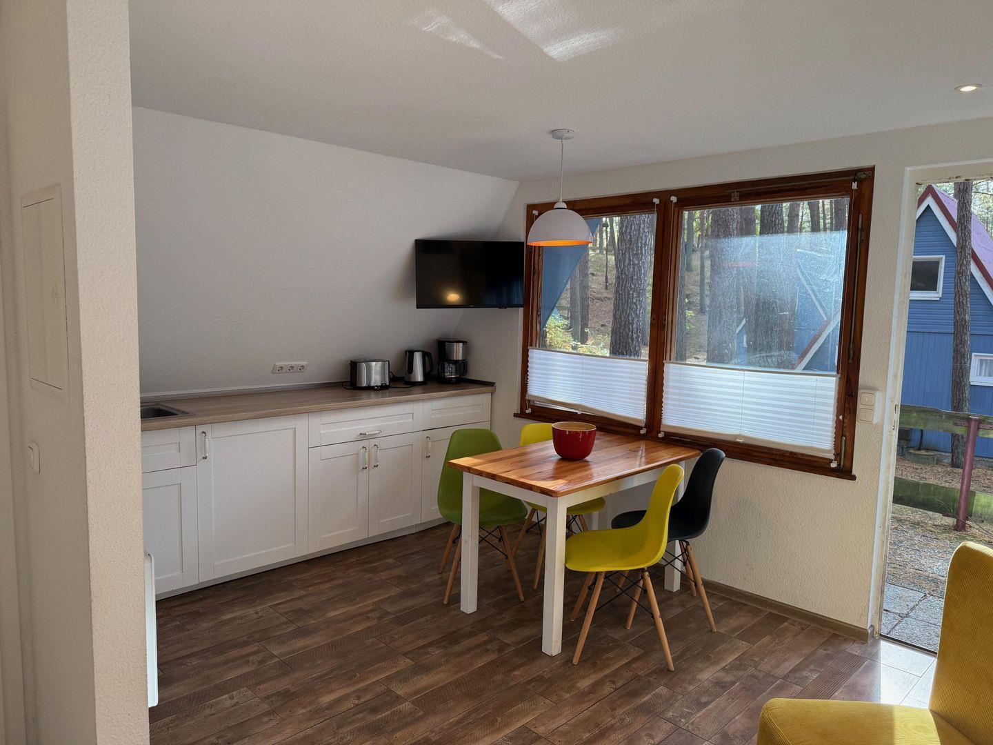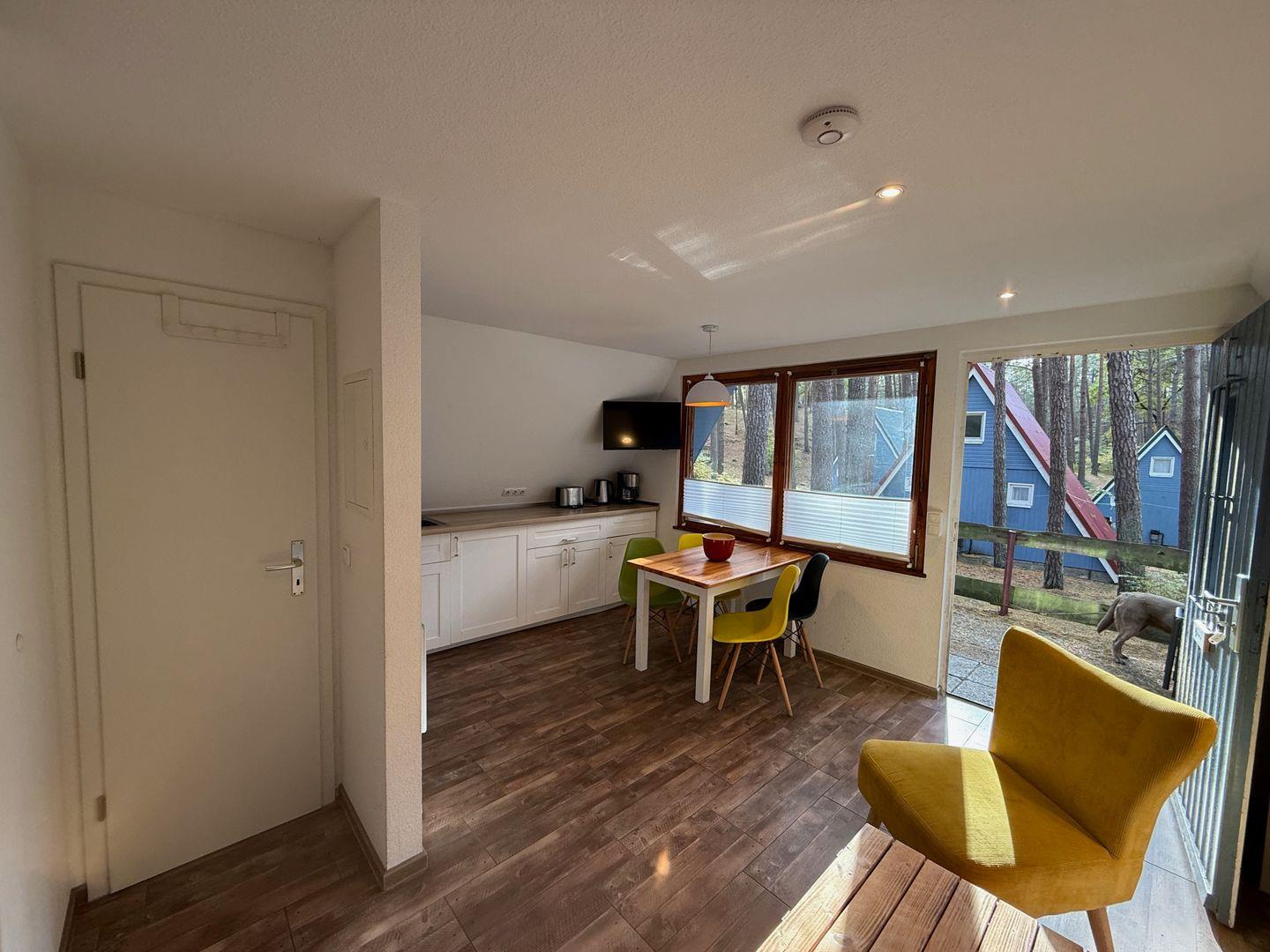 Drinnen warten ca. 30 m², die mehr können, als man denkt. Im Wohnzimmer treffen Sofa, Tisch und Stühle auf eine große Terrassentür, die den Wald direkt ins Haus holt. Die Schlafgalerie unterm Dach ist kuschelig und luftig zugleich – vier Betten für Erwachsene oder Kinder. IAlles schlicht, praktisch, ein bisschen skandinavisch – und mit Heizung für kühle Abende.