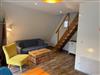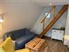 Drinnen warten ca. 30 m², die mehr können, als man denkt. Im Wohnzimmer treffen Sofa, Tisch und Stühle auf eine große Terrassentür, die den Wald direkt ins Haus holt. Die Schlafgalerie unterm Dach ist kuschelig und luftig zugleich – vier Betten für Erwachsene oder Kinder. IAlles schlicht, praktisch, ein bisschen skandinavisch – und mit Heizung für kühle Abende.