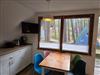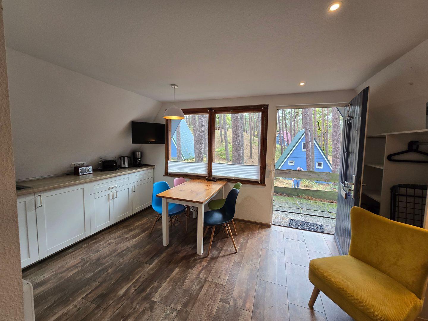 Drinnen warten ca. 30 m², die mehr können, als man denkt. Im Wohnzimmer treffen Sofa, Tisch und Stühle auf eine große Terrassentür, die den Wald direkt ins Haus holt. Die Schlafgalerie unterm Dach ist kuschelig und luftig zugleich – vier Betten für Erwachsene oder Kinder. IAlles schlicht, praktisch, ein bisschen skandinavisch – und mit Heizung für kühle Abende.