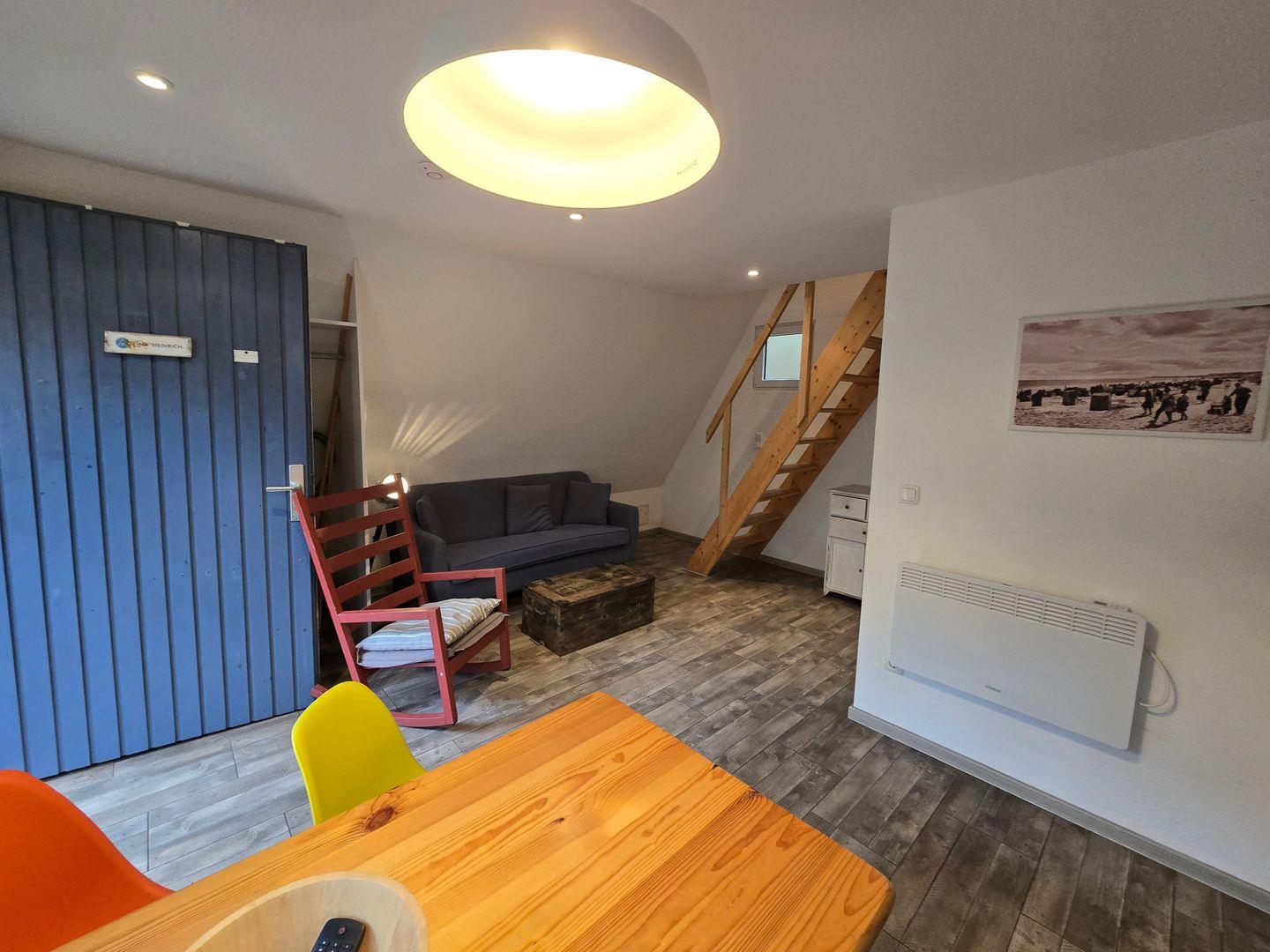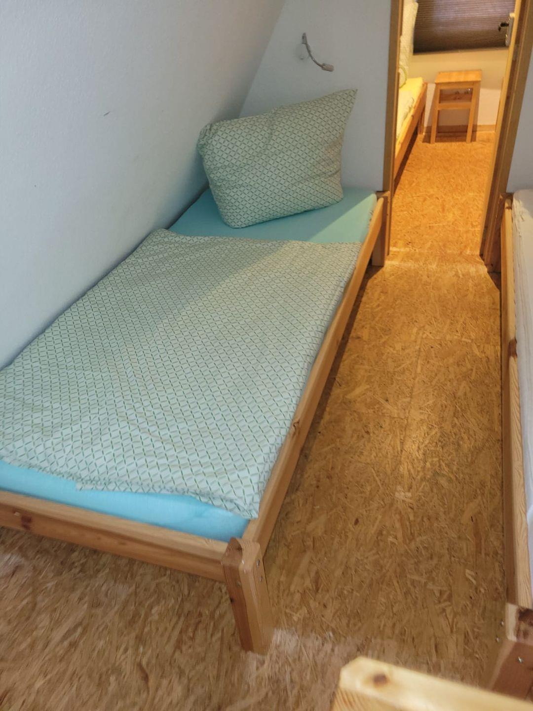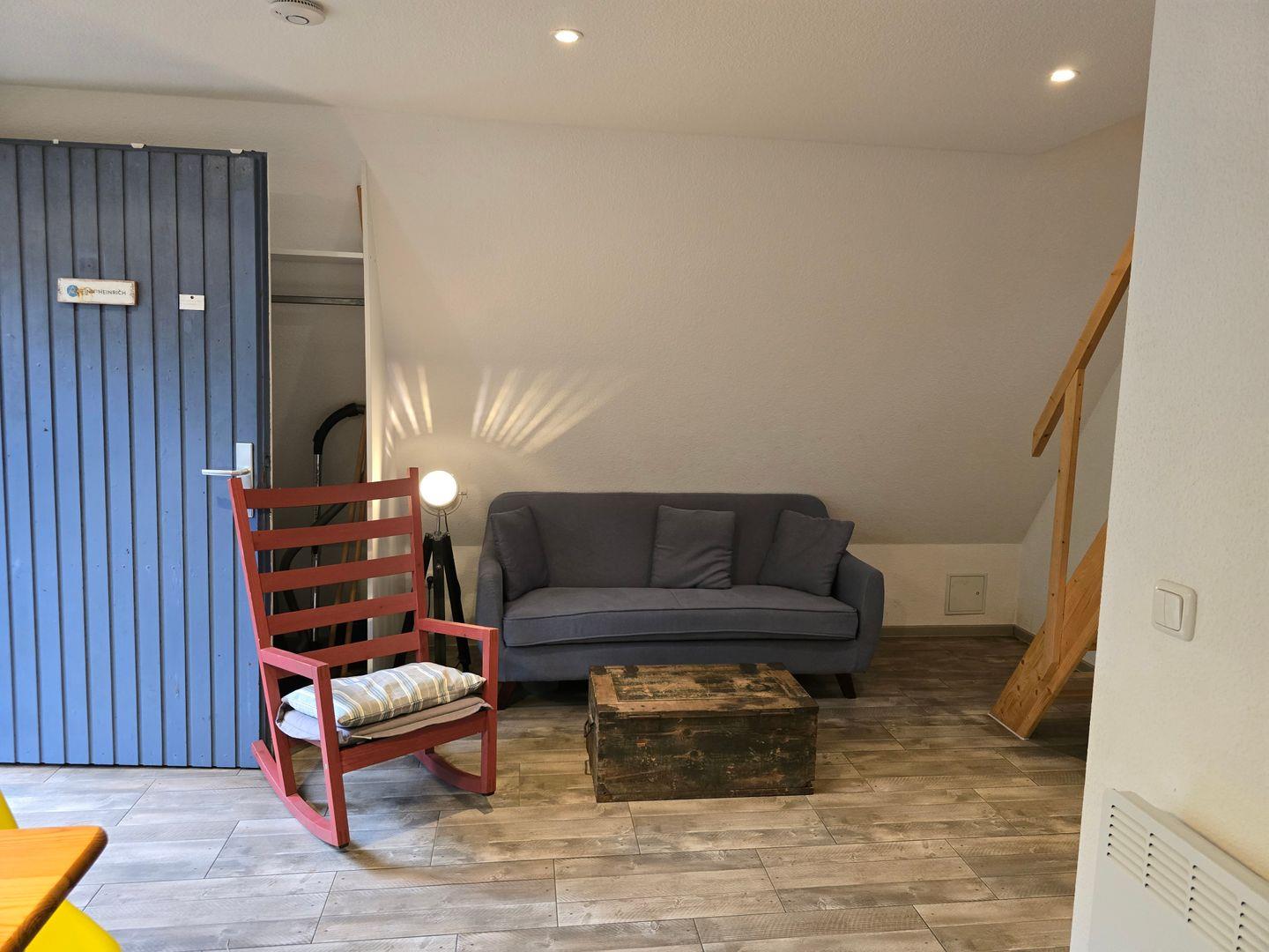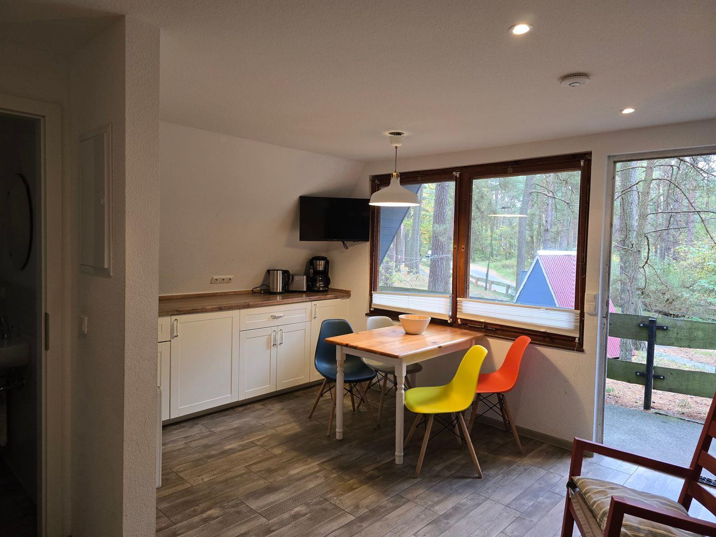 Drinnen warten ca. 30 m², die mehr können, als man denkt. Im Wohnzimmer treffen Sofa, Tisch und Stühle auf eine große Terrassentür, die den Wald direkt ins Haus holt. Die Schlafgalerie unterm Dach ist kuschelig und luftig zugleich – vier Betten für Erwachsene oder Kinder. IAlles schlicht, praktisch, ein bisschen skandinavisch – und mit Heizung für kühle Abende.