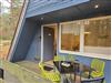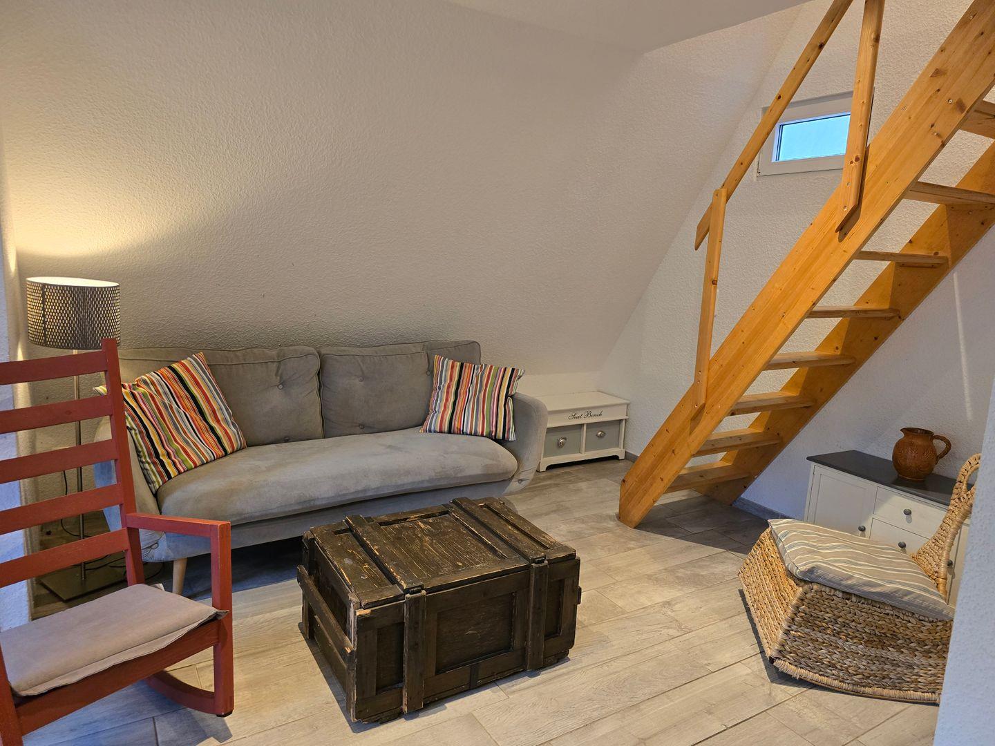 Drinnen warten ca. 30 m², die mehr können, als man denkt. Im Wohnzimmer treffen Sofa, Tisch und Stühle auf eine große Terrassentür, die den Wald direkt ins Haus holt. Die Schlafgalerie unterm Dach ist kuschelig und luftig zugleich – vier Betten für Erwachsene oder Kinder. IAlles schlicht, praktisch, ein bisschen skandinavisch – und mit Heizung für kühle Abende.