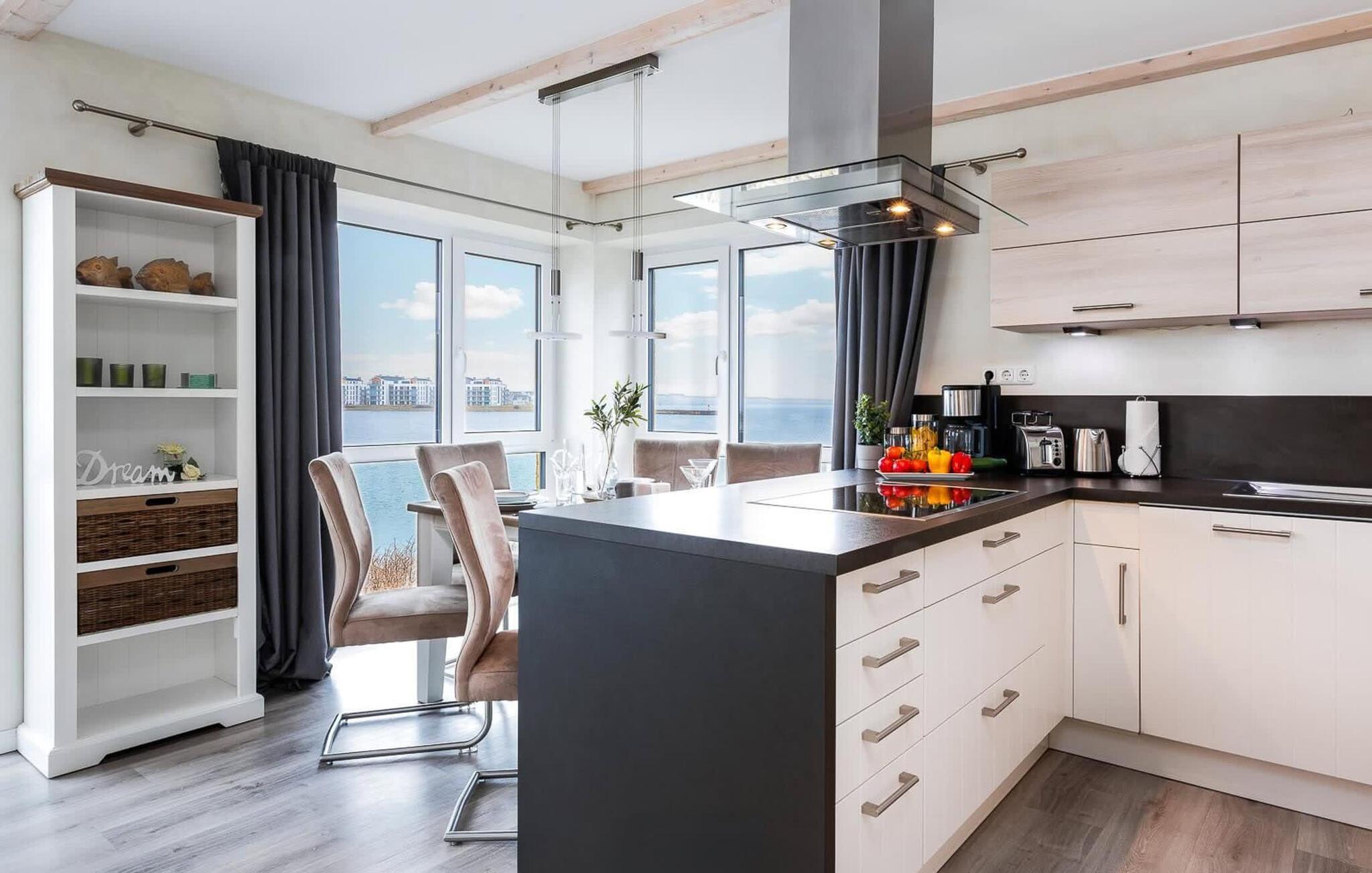 Die Ferienwohnung ist sehr hochwertig und stilvoll in Naturtönen und bewusst klaren und schlichten Formen gehalten. Sie bietet an anspruchsvoller Ausstattung alles für einen rundum gelungenen Urlaub am Meer. Der großzügige Wohn- /Essbereich mit bodentiefen Fenstern, Sitzlandschaft und dem großen Esstisch für 6 Personen ist der Mittelpunkt der Wohnung. Hier finden gemütliche Momente vor dem Kaminofen statt und gemeinsame Mahlzeiten, die in der technisch voll ausgestatteten Küche gezaubert werden können.