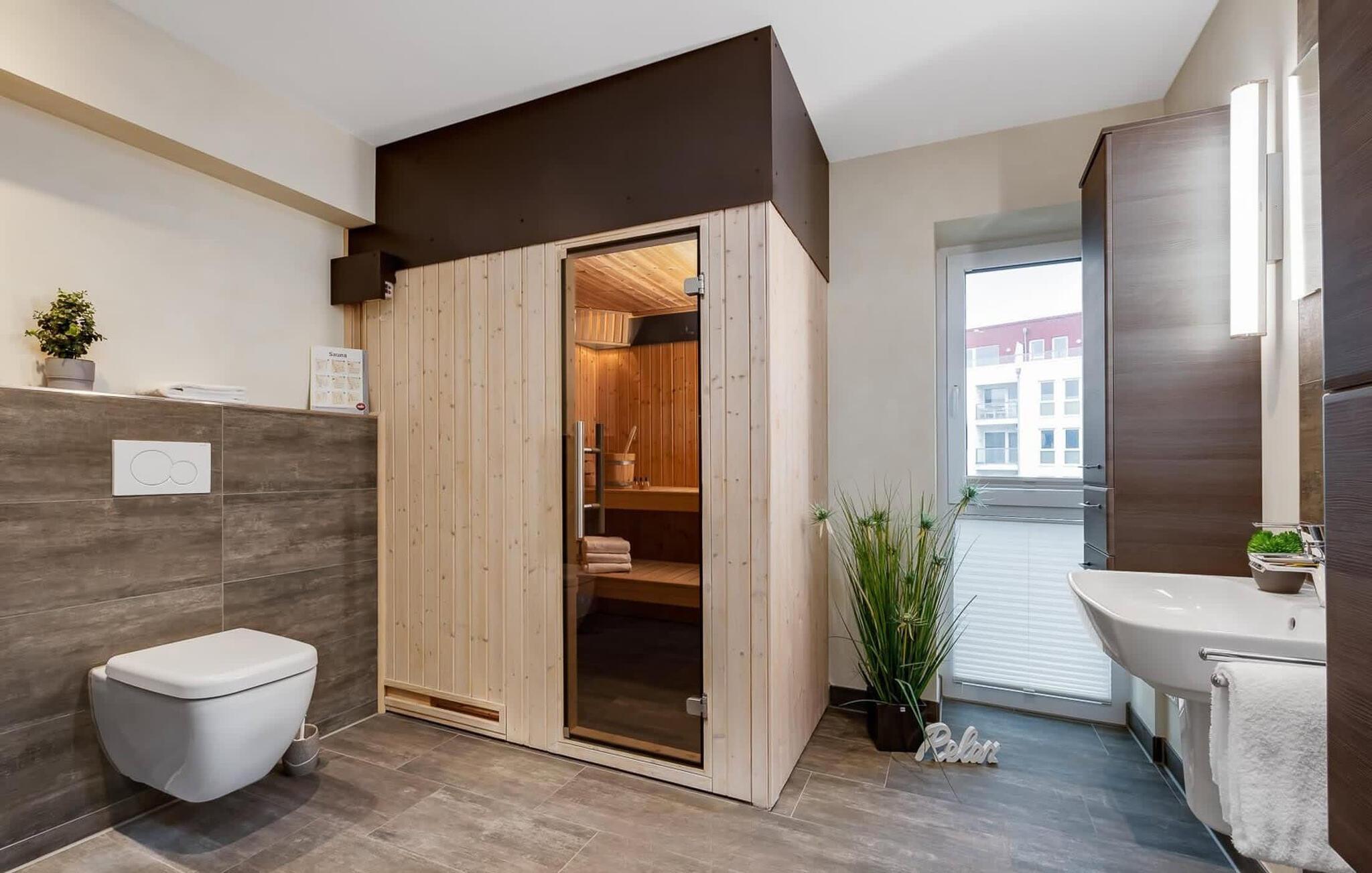 In dem modernen Hauptbadezimmer befindet sich eine finnische Sauna, die das persönliche Wohlfühlprogramm mit einer unvergleichlichen Aussicht auf die Schleimündung und den Hafen des Resorts krönt.