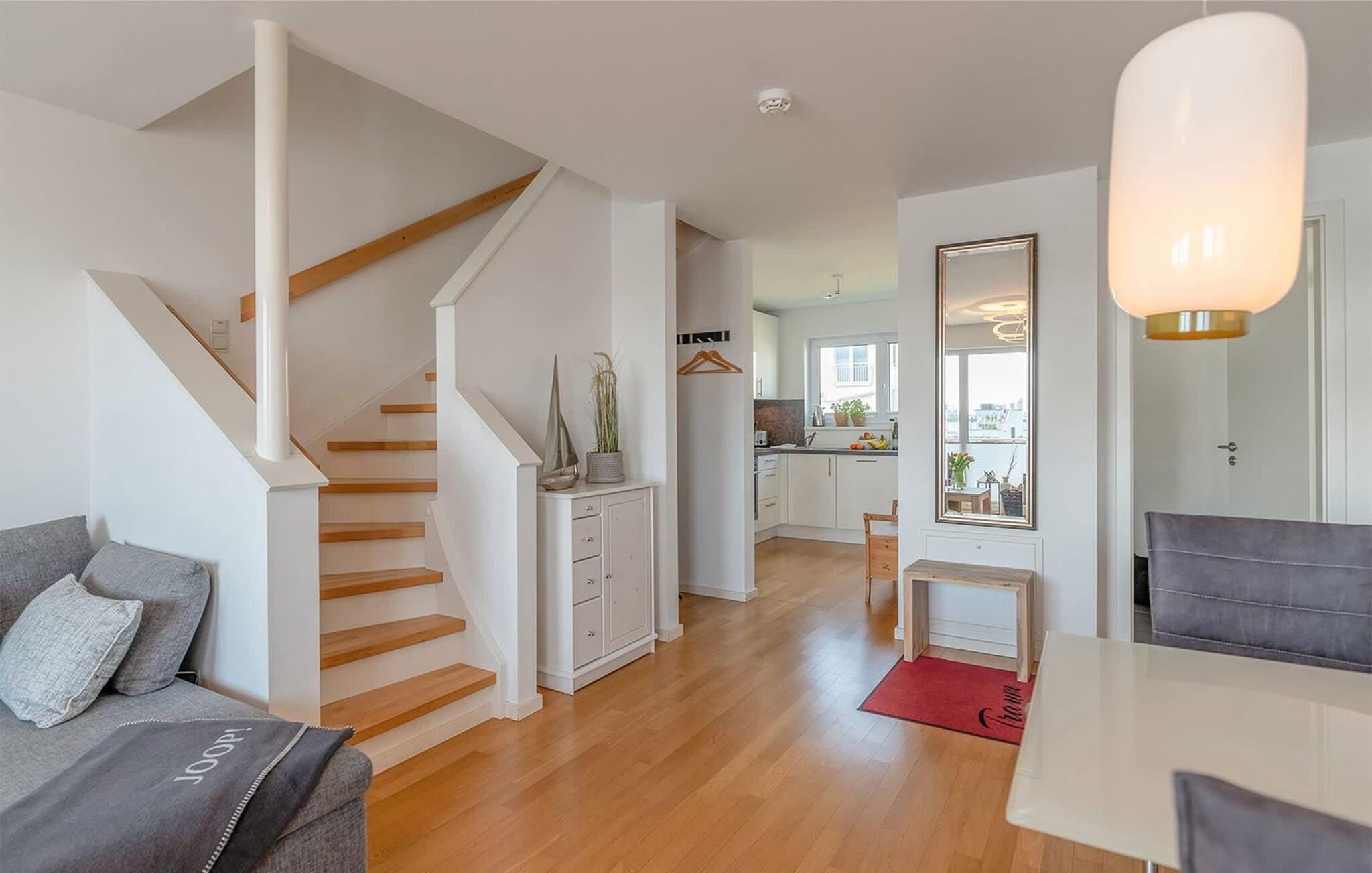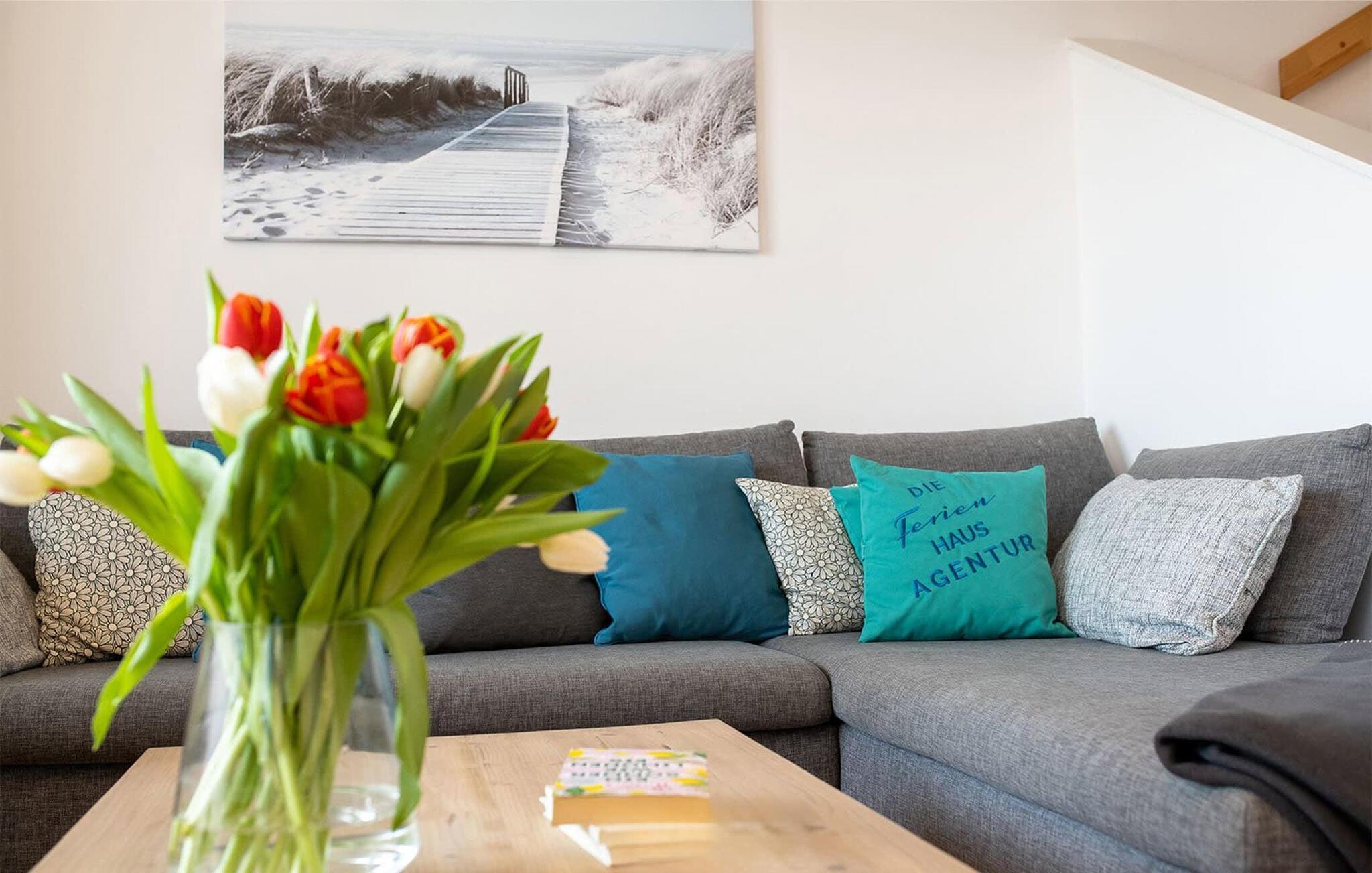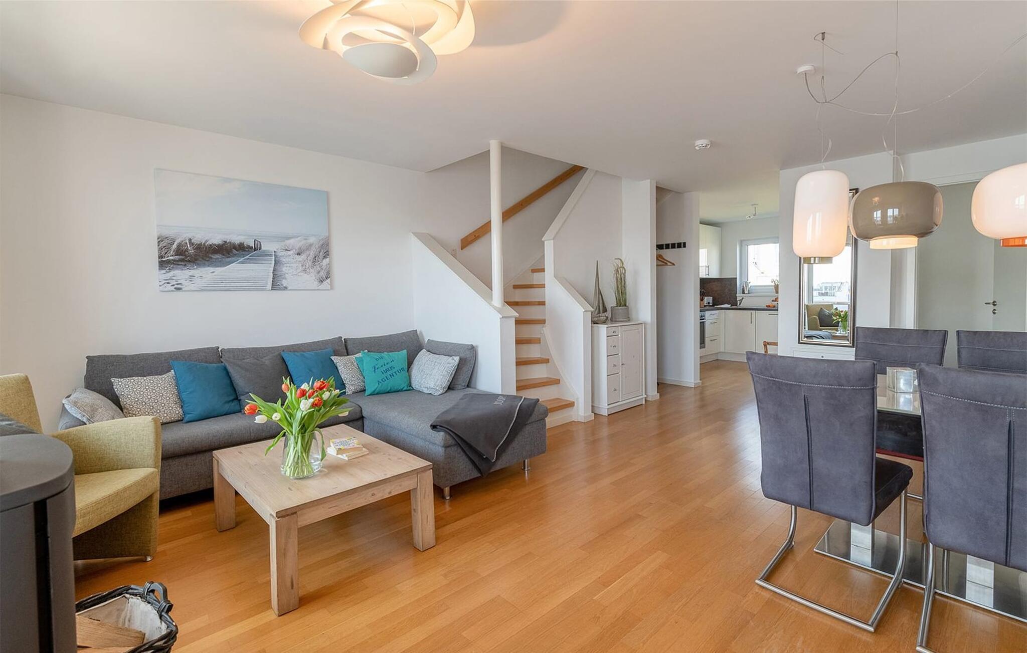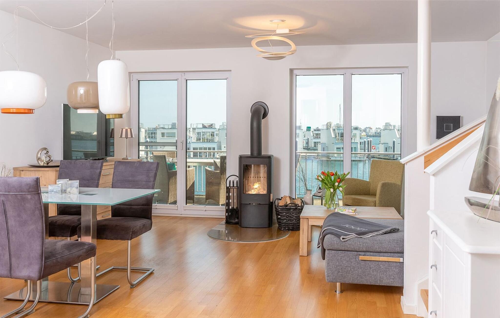 Das Ferienhaus Traumblick ist sehr hochwertig und stilvoll in moderner Form eingerichtet. Es bietet an anspruchsvoller Ausstattung alles für einen rundum gelungenen Urlaub am Meer. Der offene Wohn- /Essbereich im Erdgeschoss mit bodentiefen Fenstern, Sitzlandschaft und dem Esstisch ist der Mittelpunkt des Hauses. Hier finden gemütliche Momente vor dem Kaminofen statt und gemeinsame Mahlzeiten, die in der anliegenden voll ausgestatteten Küche gezaubert werden können.