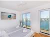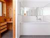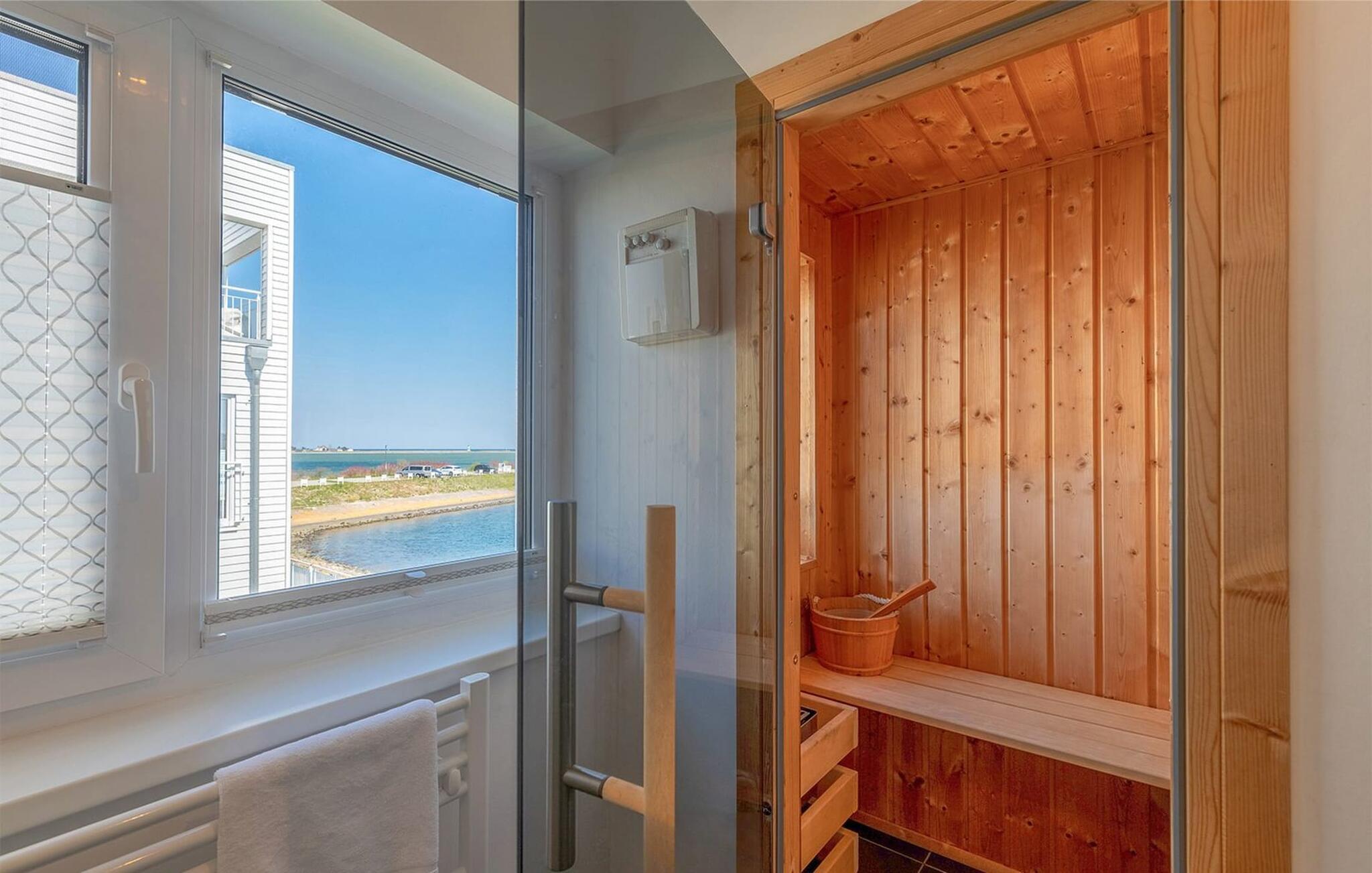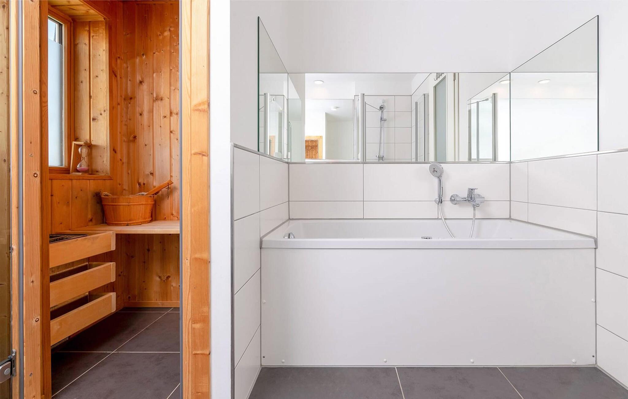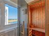 In dem modernen Hauptbadezimmer befinden sich für das persönliche Wohlfühlprogramm eine Whirlwanne und eine finnische Sauna mit Ausblick auf den Leuchtturm von Schleimünde.
