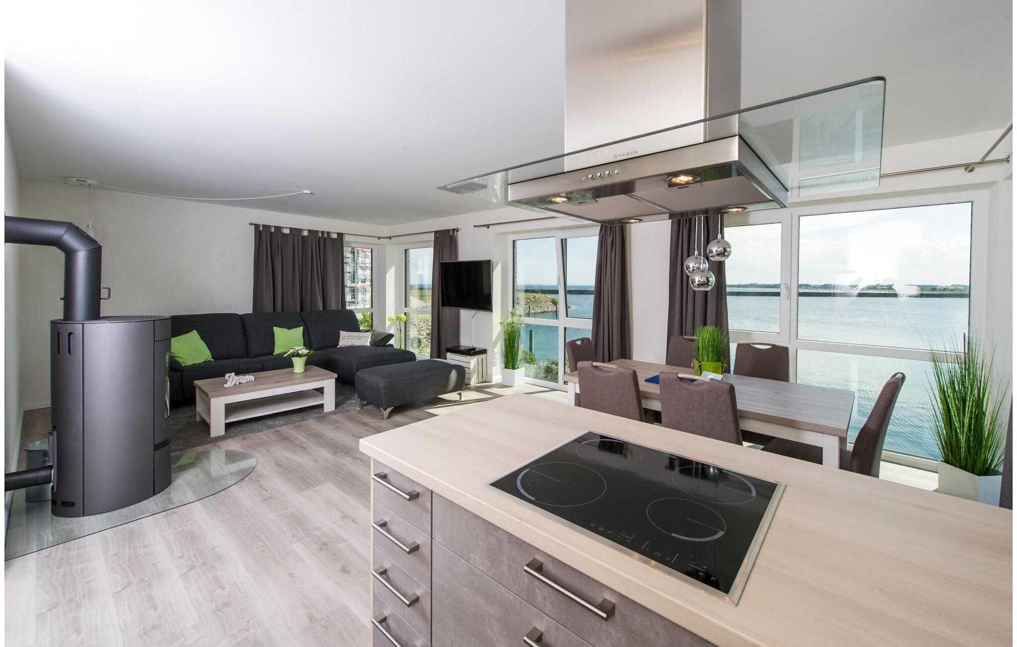 Der großzügige und lichtdurchflutete Wohn- /Essbereich stellt den Mittelpunkt der Ferienwohnung dar und überzeugt mit bodentiefen Fenstern, einer gemütlichen Sitzlandschaft und einem großen Esstisch, alles vor einzigartiger Wasserkulisse. Die offen gestaltete Küche bietet an hochwertiger Technik und Ausstattung alles, was das Kochherz begehrt.