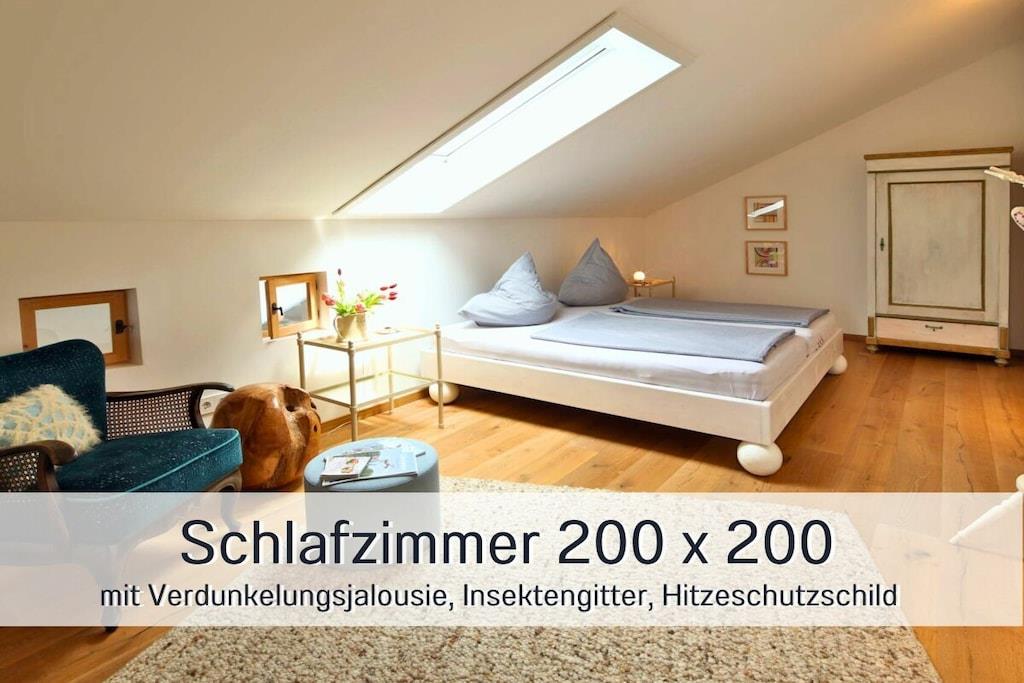 Entdecken Sie unser Apartment "Am Weiher", ein ländliches Idyll in der Nähe des Chiemsees. Mit 94 qm Wohnfläche, separatem Treppenaufgang und Balkonterrasse bietet dieses komfortabele Refugium ein großzügiges Wohnambiente. Voll ausgestattete Küche mit großem Esstisch, modernes Bad mit Fußbodenheizung und Eichendielenböden in allen Räumen, selbstschließende Dachfenster mit integriertem Hitzeschild , Verdunkelungsjalousie und Insektenschutz sorgen für angenehme Nächte. Zwei bequeme Couches stehen bereit, um Sie nach einem erlebnisreichen Tag in der Umgebung in eine Oase der Entspannung zu führen. Über den Treppenaufgang im Innenbereich gelangt man zum Schlafzimmer. Vor dem Schlafraum befindet sich eine Galerie zum Lesen und Relaxen.