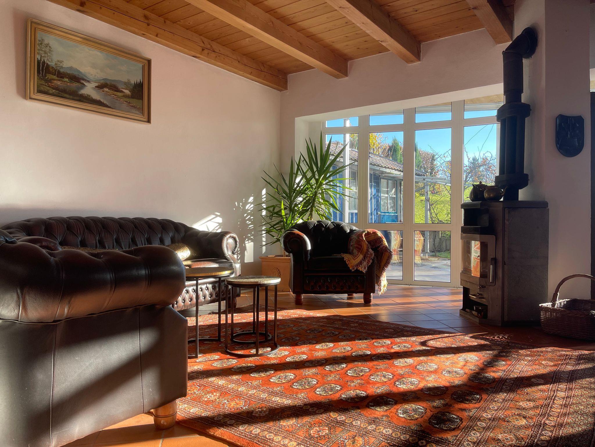 Große Fenster öffnen den Blick in die Natur und die umliegenden Berge-das Haus ist von Licht durchflutet und schenkt zu jeder Tageszeit eine besondere Stimmung.