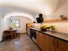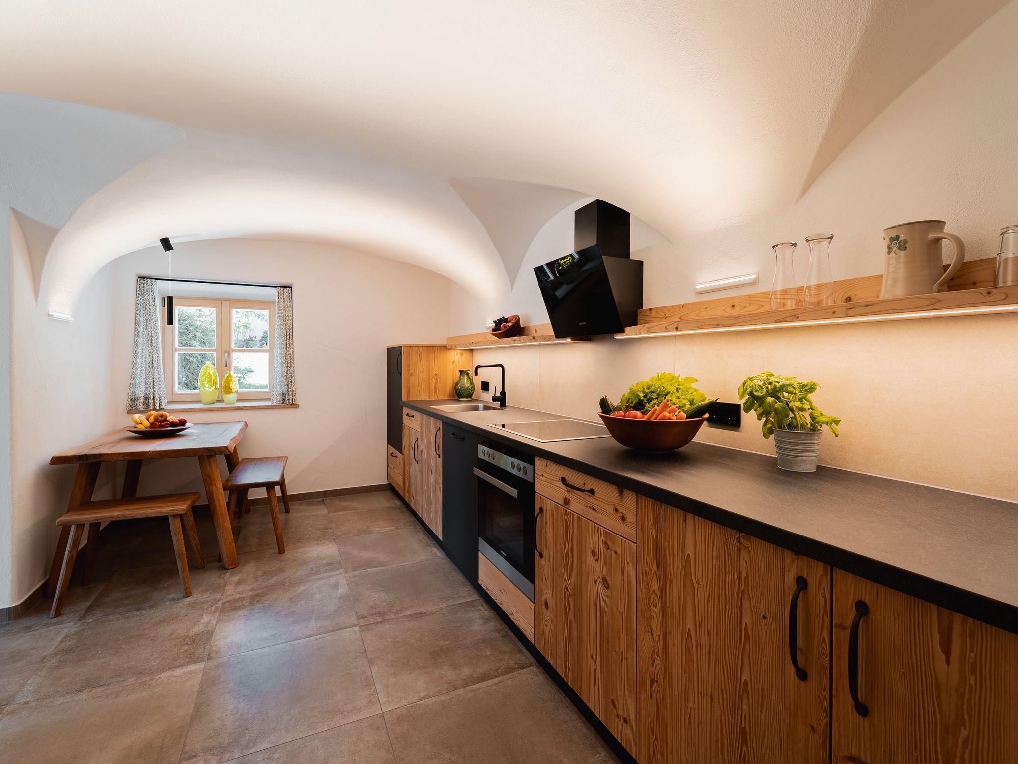 Massives Holz und Altholz, maßgefertigte Möbel sowie gemütliche Grüntöne und Naturleinen bestimmen das Interieur der Wohnung. Eine moderne Küche, in der die alte Gewölbedecke erhalten wurde. 60 m² großes Apartment, 25 m² Terrasse nach Osten und eigener umzäunter Garten (Hunde willkommen) mit Aussicht auf den hofeigenen Bauerngarten.