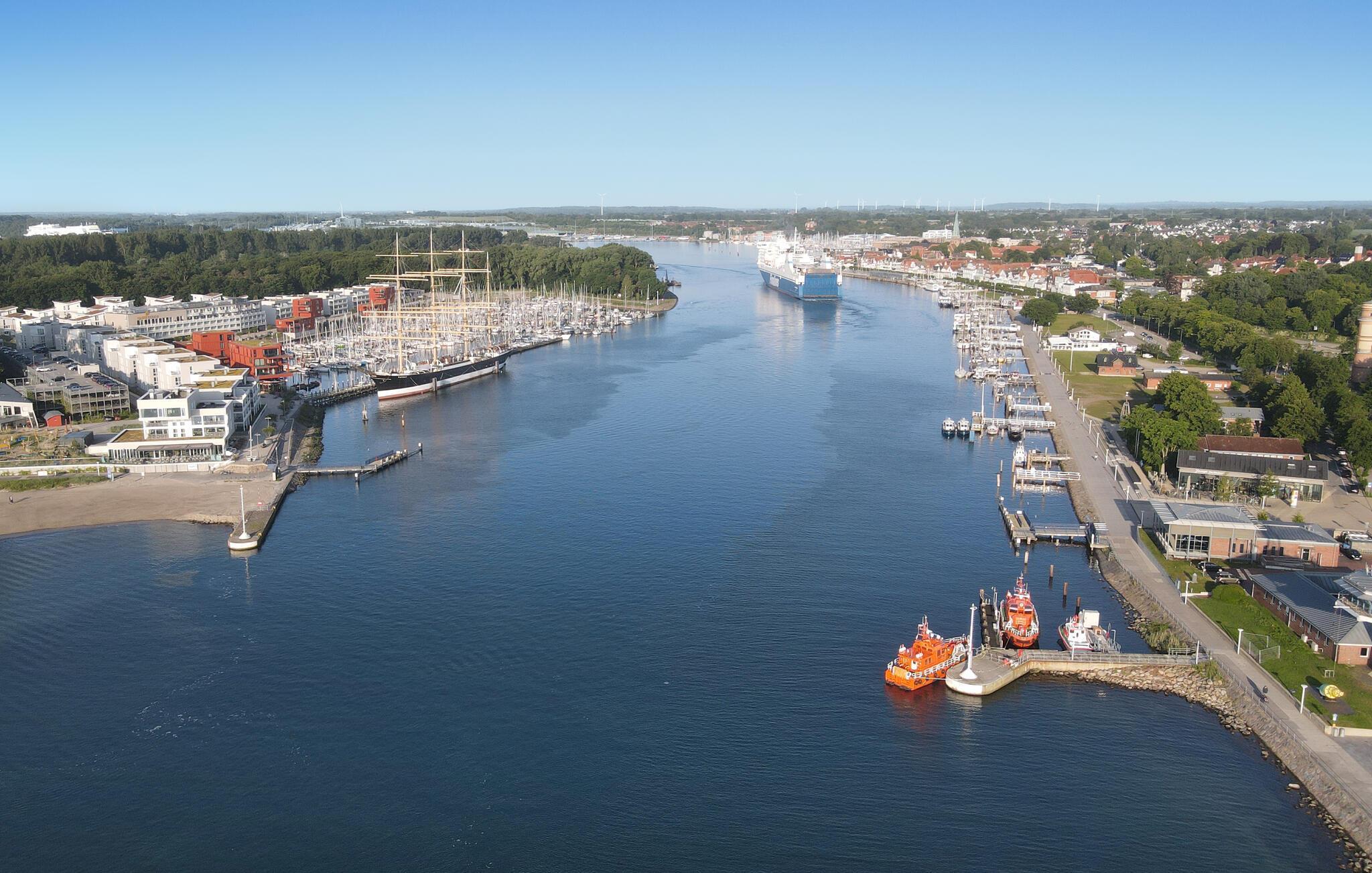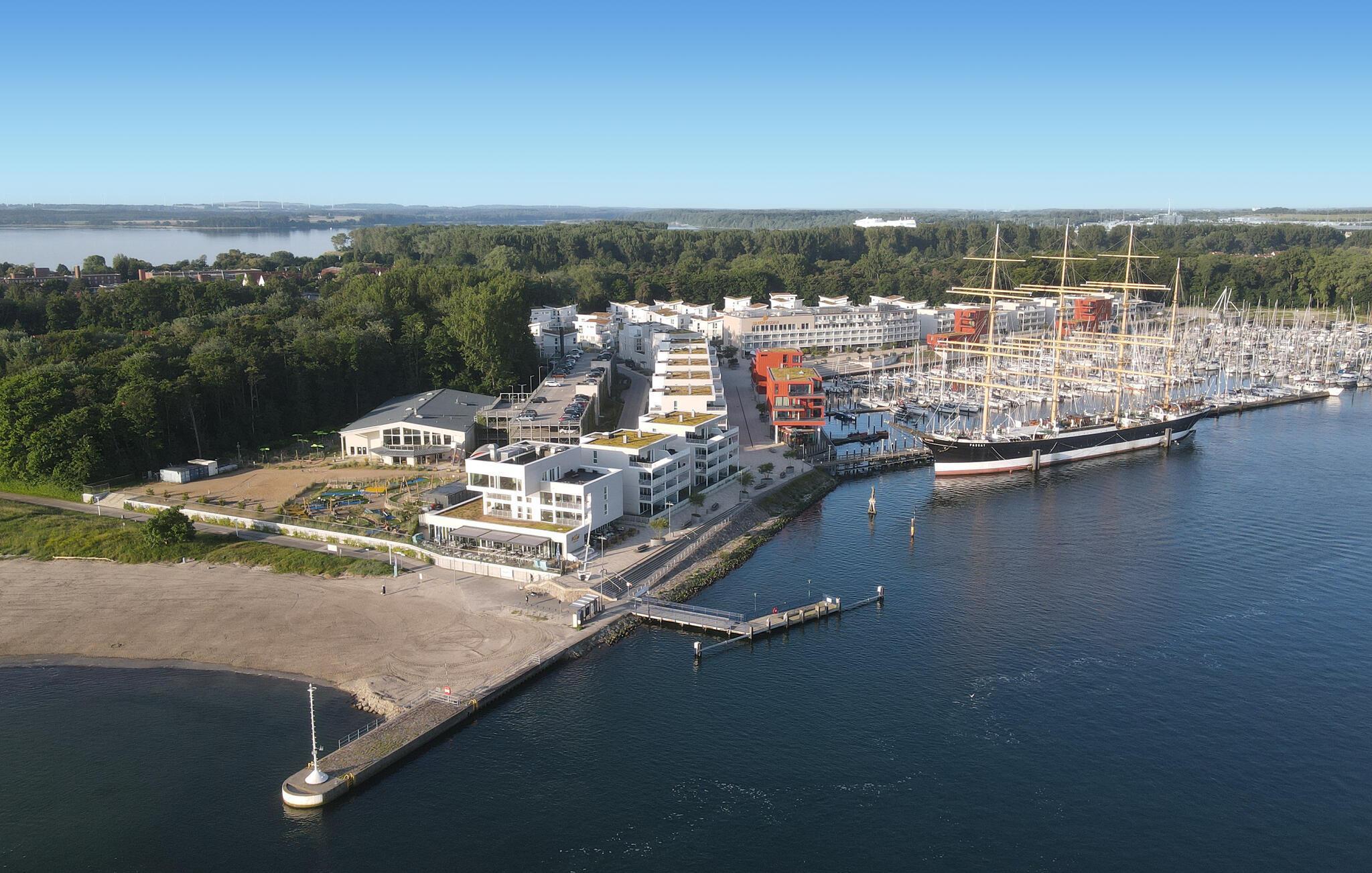 Im angrenzenden Sportboothafen liegt die Viermastbark „Passat“, ein Segelschiff von 1911 und heute ein zu besichtigendes Museumsschiff.