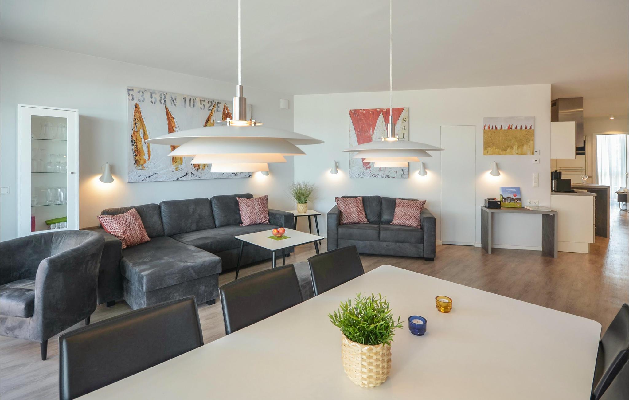 Die Wohnung ist stilvoll, hochwertig und modern eingerichtet. Ein besonderes Highlight ist das Bad, Ihr persönlicher kleiner Wellnessbereich mit Sauna, Whirlpool und Dampfbad mit integrierter Doppelregendusche. Das Wohlfühlprogramm setzt sich im Wohnbereich fort, denn die flackernden Flammen des Bioethanolkamins tauchen den Raum in ein besonders gemütliches Licht. Das Sofa lässt sich mit wenigen Handgriffen in zwei bequeme Schlafmöglichkeiten umwandeln.